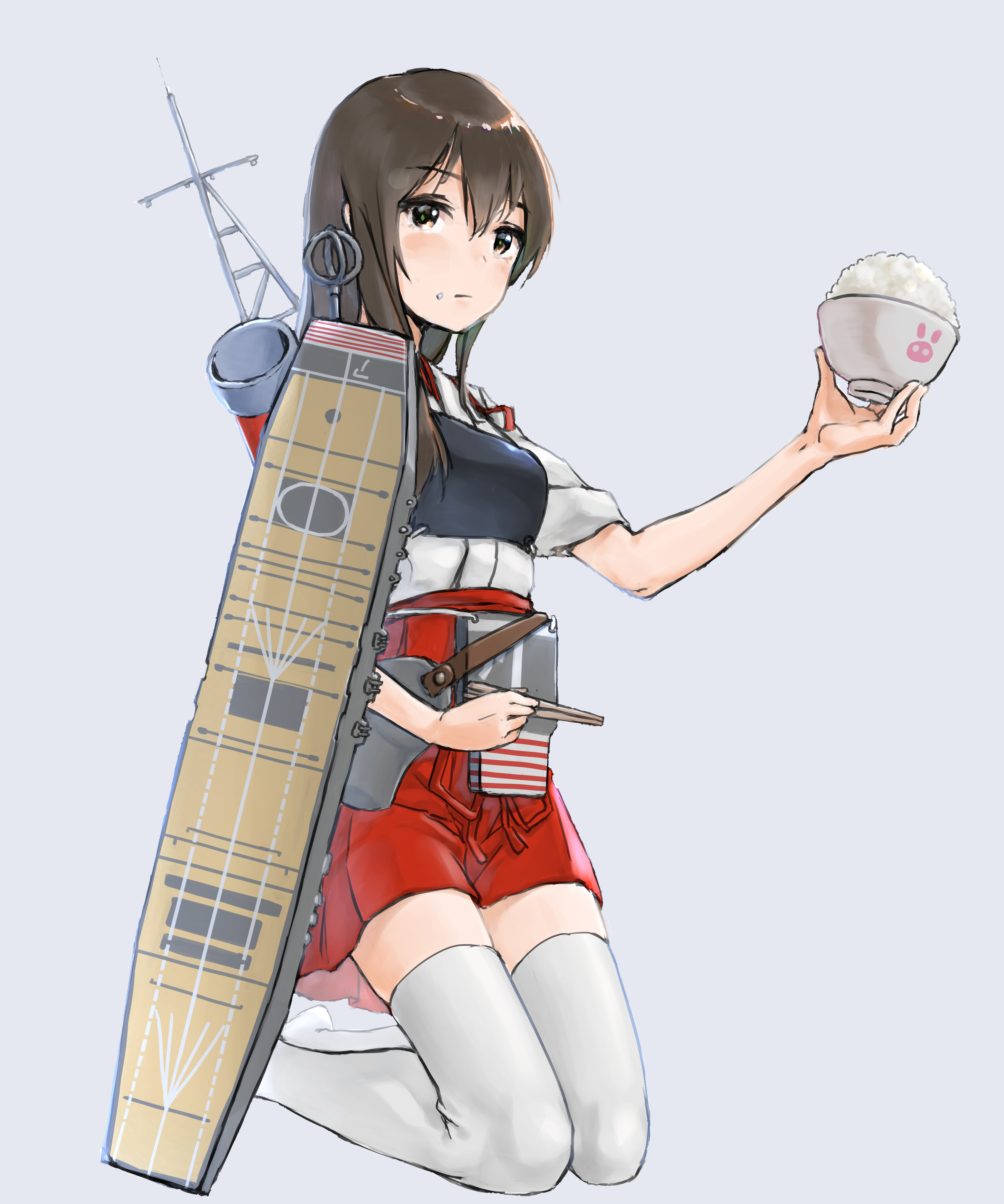 1girl absurdres akagi_(kancolle) bowl breasts brown_eyes brown_hair chopsticks flight_deck food food_on_face grey_background hair_between_eyes hakama hakama_skirt highres holding holding_bowl holding_chopsticks japanese_clothes kangoku_kou kantai_collection kimono kneeling long_hair looking_at_viewer muneate quiver red_hakama rice rice_bowl rice_on_face rigging simple_background skirt solo tasuki thighhighs white_kimono white_thighhighs