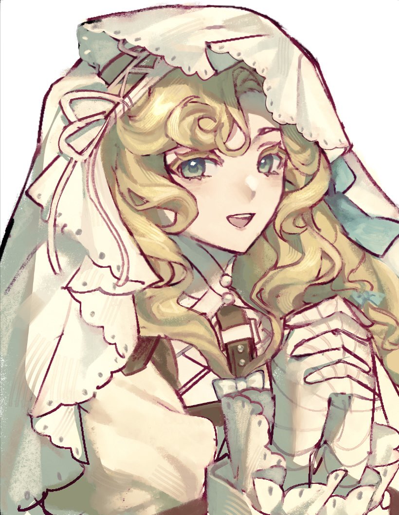 1girl :d bandaged_hand bandages blonde_hair blue_eyes dress hands_up interlocked_fingers long_hair lorelei_(reverse:1999) open_mouth own_hands_together praying reverse:1999 siriinwza smile solo upper_body veil white_background white_dress white_veil