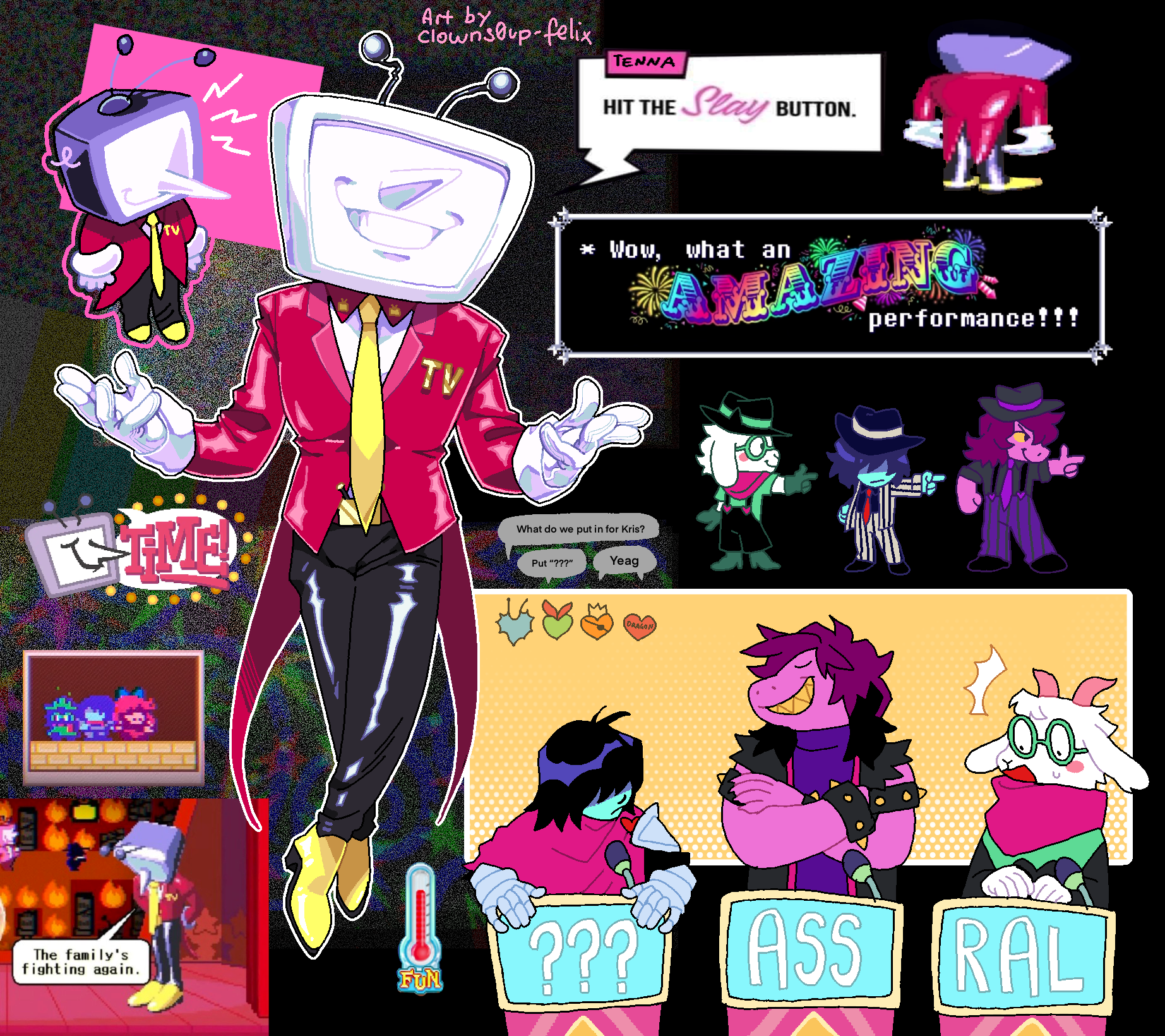 1girl 1other 2boys ant_tenna armor artist_name belt black_overalls black_pants black_shoes blue_skin blush_stickers cape clowns0up-felix colored_skin commentary crossed_arms deltarune english_commentary english_text fedora furry furry_female furry_male game_screenshot_inset gloves green-framed_eyewear green_shirt green_shoes grey_shirt hat highres jacket kris_(dark_world)_(deltarune) kris_(deltarune) kris_(gangster)_(deltarune) multiple_boys multiple_views necktie object_head open_clothes open_jacket overalls pants pink_cape pink_scarf pink_skin pointy_nose purple_hair purple_necktie purple_pants ralsei ralsei_(gangster) red_necktie round_eyewear scarf shirt shoes smile spiked_wristband striped_clothes striped_jacket striped_pants susie_(dark_world)_(deltarune) susie_(deltarune) susie_(gangster)_(deltarune) suspenders tailcoat teeth utdr_(toby_fox) vertical-striped_clothes vertical-striped_jacket vertical-striped_pants white_gloves yellow_necktie yellow_shoes