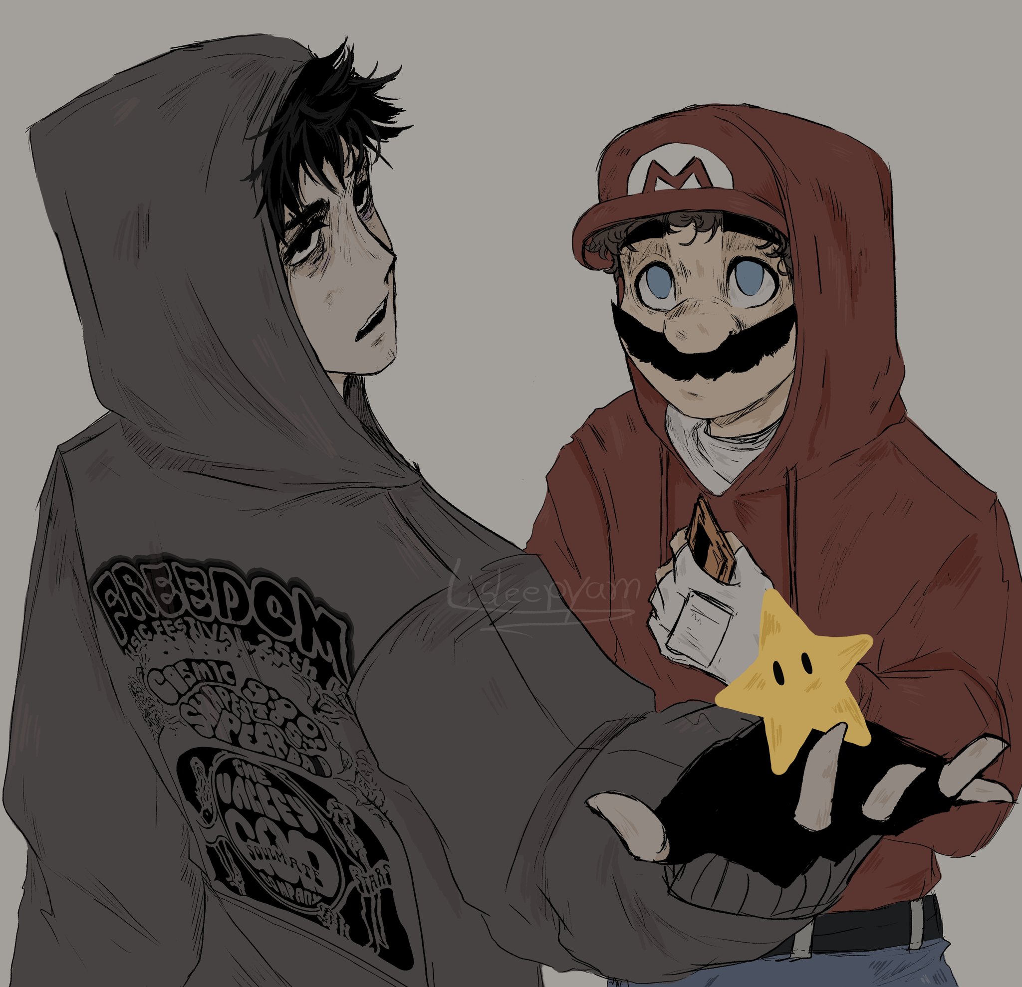 2boys belt black_gloves black_hair blue_eyes cry_of_fear denim facial_hair fingerless_gloves gloves grey_background grey_hoodie hat highres holding holding_star hood hood_up hoodie incoming_gift jeans lisleepyam looking_at_another looking_at_viewer looking_back male_focus mario mario_(series) messy_hair multiple_boys mustache nintendo open_mouth outstretched_hand pants print_hoodie red_hat red_hoodie short_hair simon_henriksson smile star_(symbol) super_mario_bros._1 teeth upper_body upper_teeth_only white_gloves
