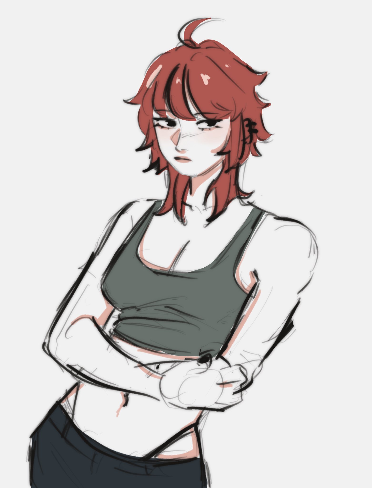 1girl ahoge black_eyes black_hair black_nails black_panties black_pants blush breasts cleavage closed_mouth crop_top crossed_arms ear_piercing earrings female_focus fingernails genderswap genderswap_(mtf) green_shirt green_tank_top highres jewelry messy_hair multicolored_hair nail_polish navel panties pants piercing red_hair shirt simple_background solo solo_focus sumino_takumi tank_top the_hundred_line_-last_defense_academy- underwear whale_tail_(clothing) white_background