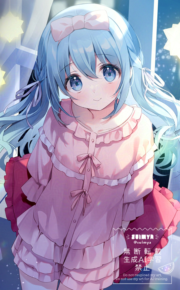1girl adversarial_noise arms_behind_back artist_name blue_eyes blue_hair bow character_request chinese_text collarbone english_text female_focus frills hair_bow hair_ribbon holding holding_pillow indoors long_hair looking_at_viewer pajamas pillow pink_bow pink_pajamas ribbon smile standing suimya tagme watermark window