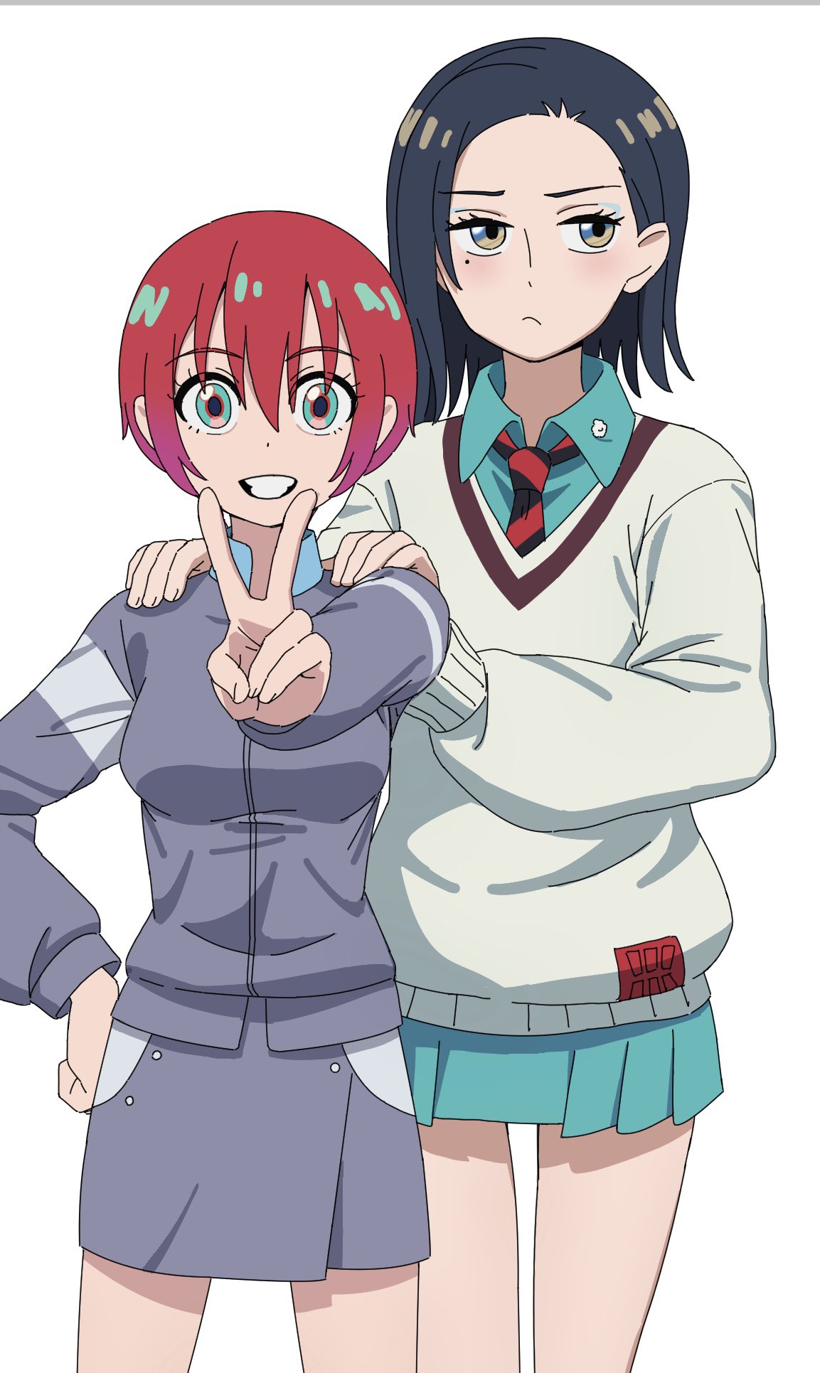 2girls amate_yuzuriha amate_yuzuriha_(cosplay) aqua_eyes aqua_shirt aqua_skirt black_hair blush breasts closed_mouth collared_shirt comoli_harcourt cosplay forehead gundam gundam_gquuuuuux highres kippei long_sleeves looking_at_viewer mole mole_under_eye multiple_girls necktie open_mouth red_hair school_uniform shirt short_hair simple_background skirt smile sweater v white_background yellow_eyes