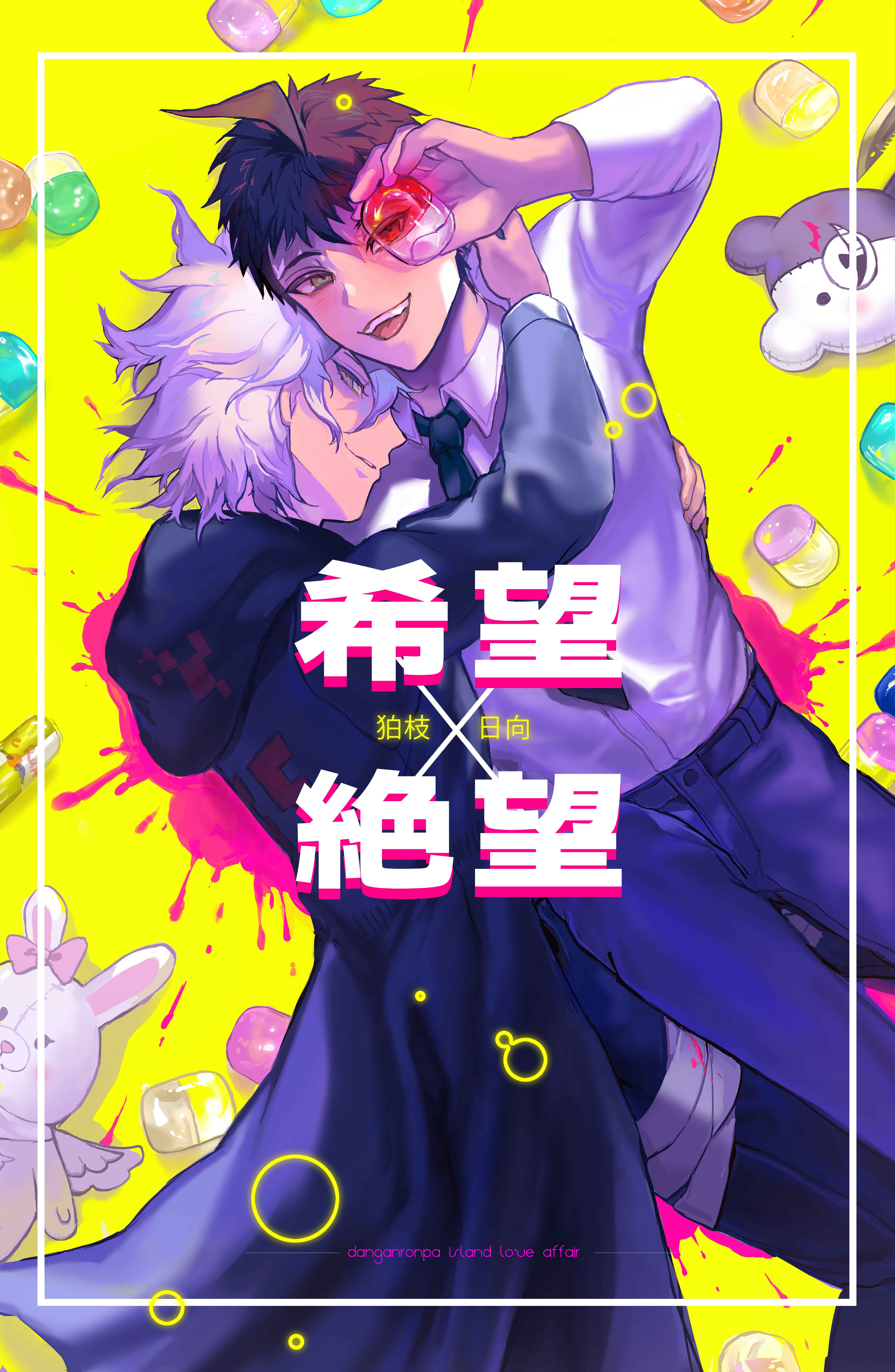 2boys :d absurdres ahoge black_pants blood brown_hair danganronpa_(series) danganronpa_2:_goodbye_despair green_jacket grey_hair grey_shirt gunmetalrose highres hinata_hajime hood hood_down jacket komaeda_nagito long_sleeves monokuma multiple_boys open_mouth pants pink_blood shirt short_hair smile teeth tongue translation_request upper_teeth_only usami_(danganronpa) wings yellow_background