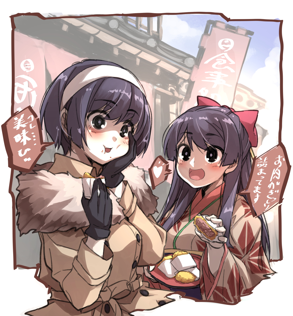2girls black_hair blush coat eating food gloves gosha_shizuku grey_hair hairband izumi_ico long_hair looking_at_another multiple_girls nie_no_hakoniwa open_mouth outdoors rikugou_suzune short_hair siblings sisters smile steamed_bun translation_request