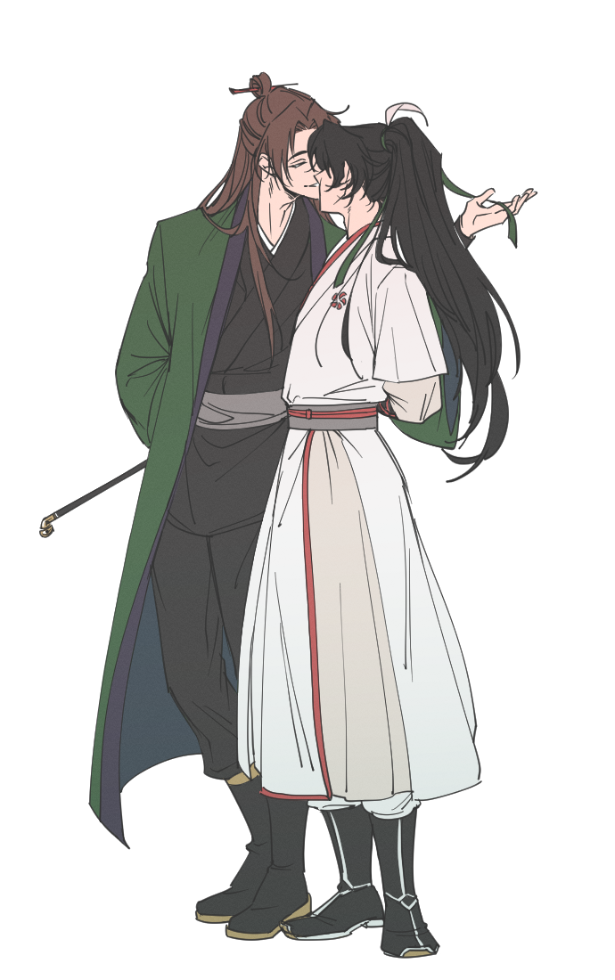 2boys ahoge arms_behind_back black_boots black_hair black_hanfu black_pants boots brown_hair cheongmyeong_(return_of_the_mount_hua_sect) chinese_clothes closed_eyes full_body gahya00 green_ribbon green_robe grey_sash hair_bun hair_ribbon hanfu high_ponytail holding holding_ribbon holding_smoking_pipe imminent_kiss kiseru korean_commentary long_hair long_sleeves male_focus multiple_boys pants ponytail return_of_the_mount_hua_sect ribbon robe simple_background smoking_pipe standing tang_bo_(return_of_the_mount_hua_sect) white_background white_hanfu wide_sleeves yaoi zhijupao