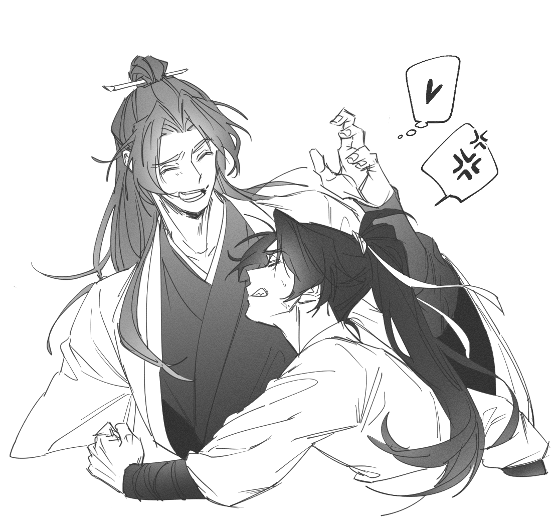 2boys anger_vein cheongmyeong_(return_of_the_mount_hua_sect) chinese_clothes clenched_hand clenched_teeth closed_eyes gahya00 greyscale hair_bun hair_ornament hair_ribbon hair_stick hanfu heart high_ponytail korean_commentary long_hair long_sleeves male_focus monochrome multiple_boys open_mouth ponytail return_of_the_mount_hua_sect ribbon simple_background smile speech_bubble spoken_anger_vein tang_bo_(return_of_the_mount_hua_sect) teeth thought_bubble upper_body