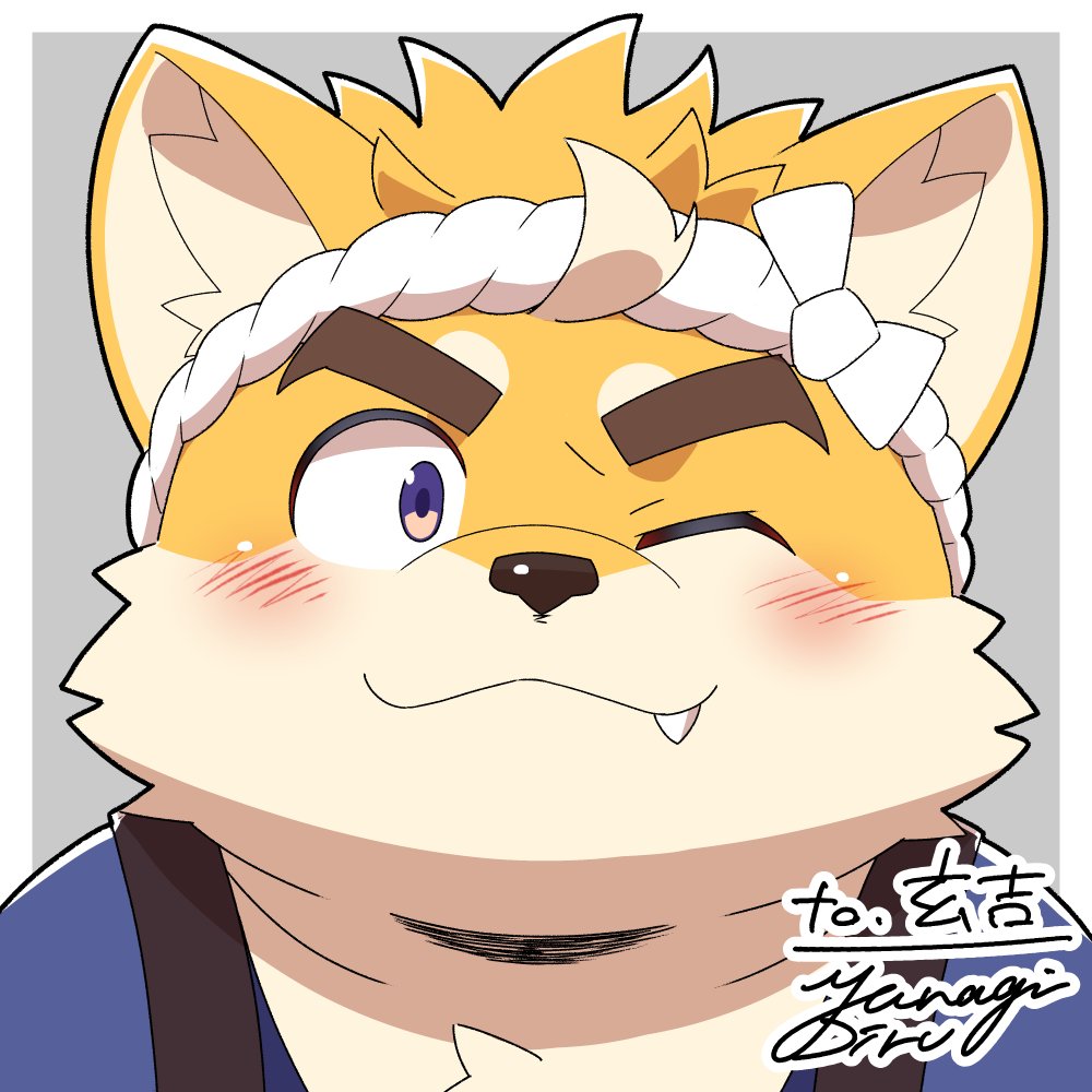 1boy :3 animal_ear_fluff animal_ears blush commentary commentary_request diru dog_boy dog_ears animal_nose english_commentary fang fang_out furry furry_male hachimaki headband japanese_clothes looking_at_viewer male_focus mixed-language_commentary musashi_(tamacolle) nejiri_hachimaki one_eye_closed signature smile tamacolle upper_body yellow_fur