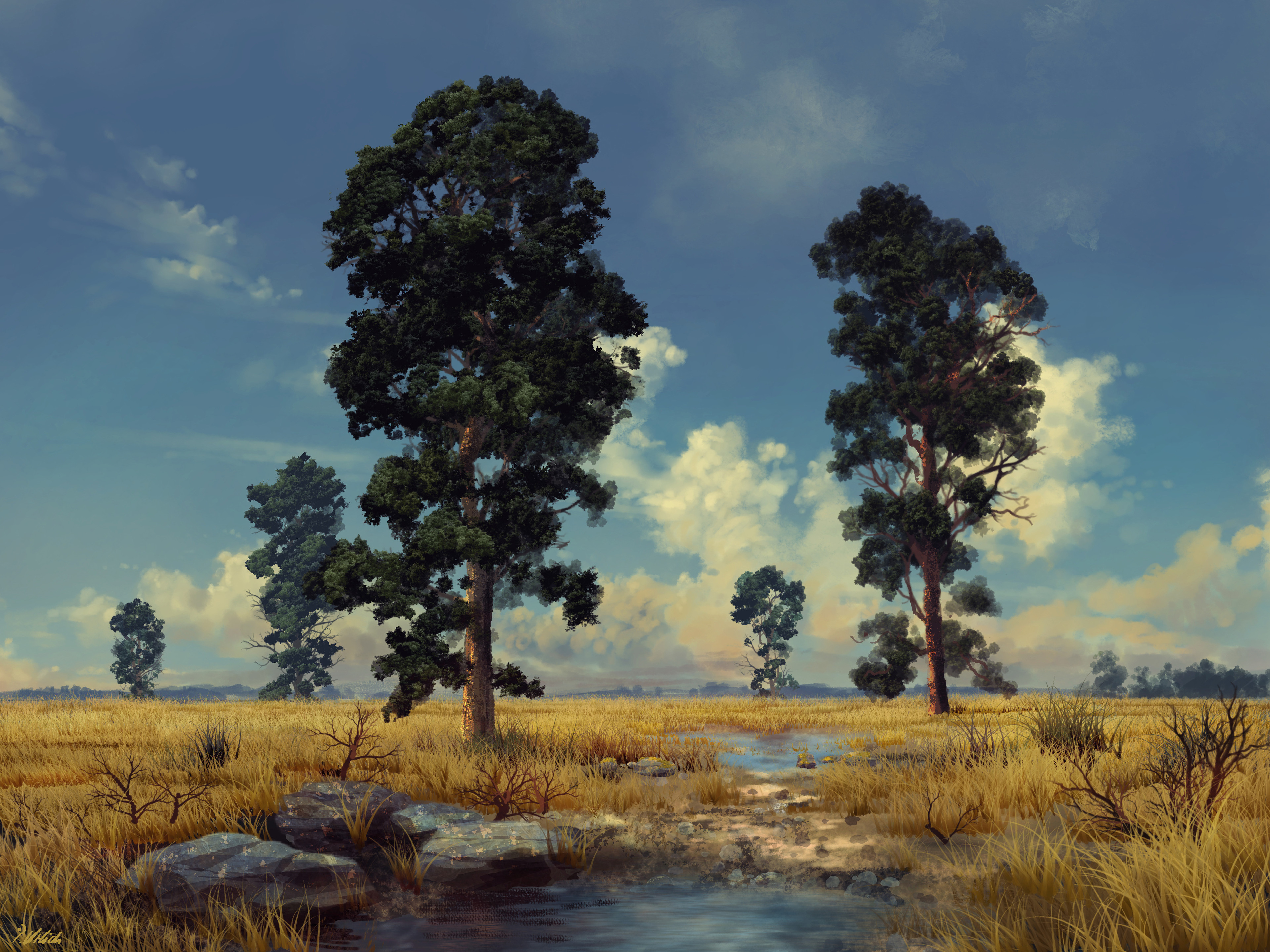 absurdres blue_sky branch commentary day english_commentary grass highres krita_(medium) landscape nature no_humans original outdoors philipp_urlich plain puddle rock scenery signature sky sunlight tree water