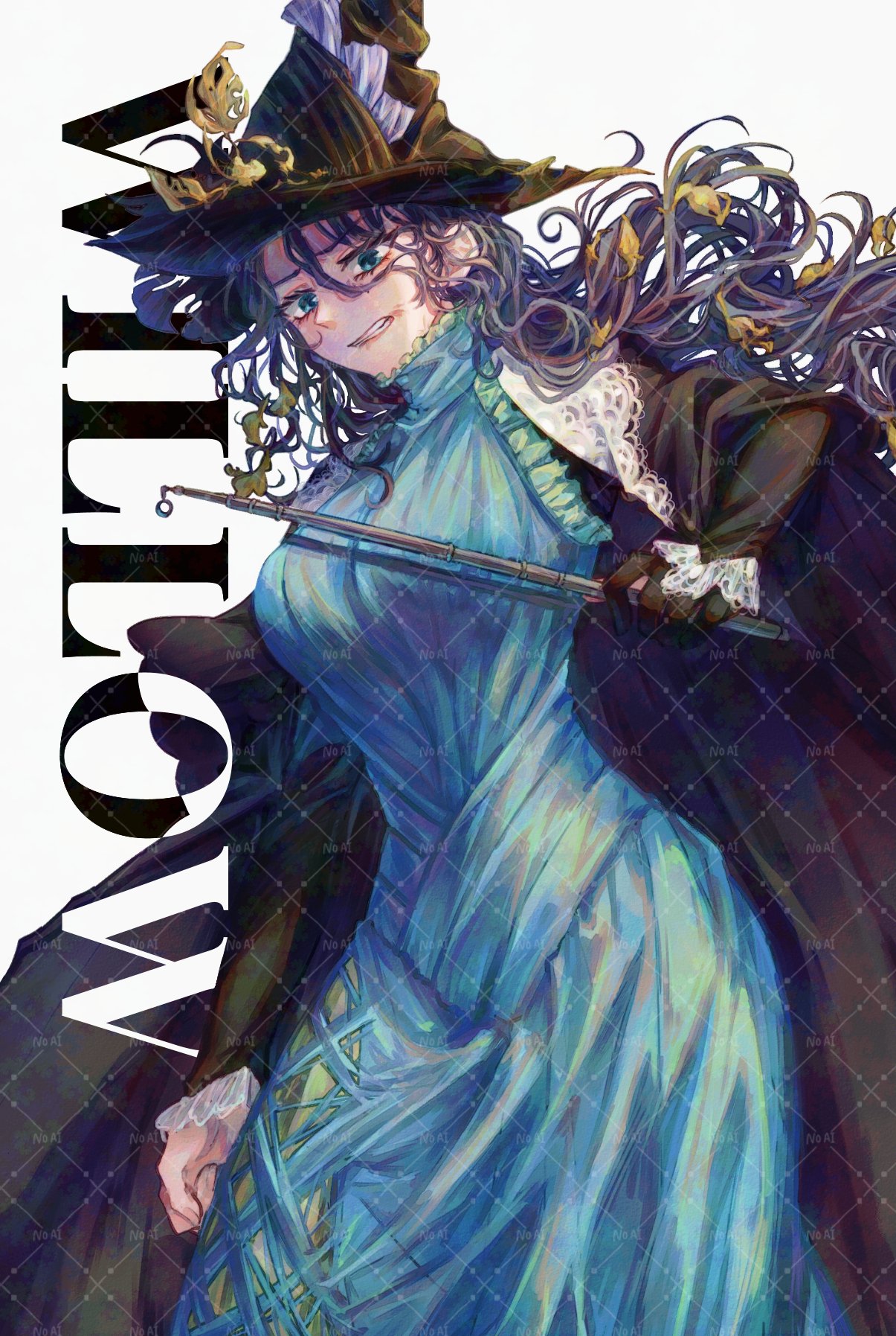 1girl black_cape black_gloves black_hair black_hat black_sleeves blue_dress blue_eyes cape character_name clenched_teeth cowboy_shot dress furrowed_brow gloves hair_ornament hand_up hat hat_ornament high_collar highres holding holding_wand leaf_hair_ornament leaf_hat_ornament long_dress long_hair long_sleeves looking_down nak_a_rt reverse:1999 single_glove solo teeth wand watermark watermark_grid wavy_hair white_background willow_(reverse:1999) witch_hat