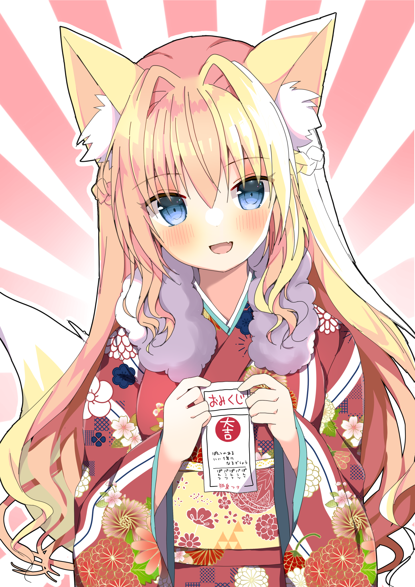 1girl :d animal_ear_fluff animal_ears blonde_hair blue_eyes blush braid copyright_request floral_print fox_ears fox_girl fox_tail fur_collar fuuna_thise hair_between_eyes hair_intakes highres holding japanese_clothes kimono long_hair long_sleeves looking_at_viewer obi open_mouth print_kimono red_kimono sash smile solo sunburst sunburst_background tail very_long_hair virtual_youtuber wide_sleeves
