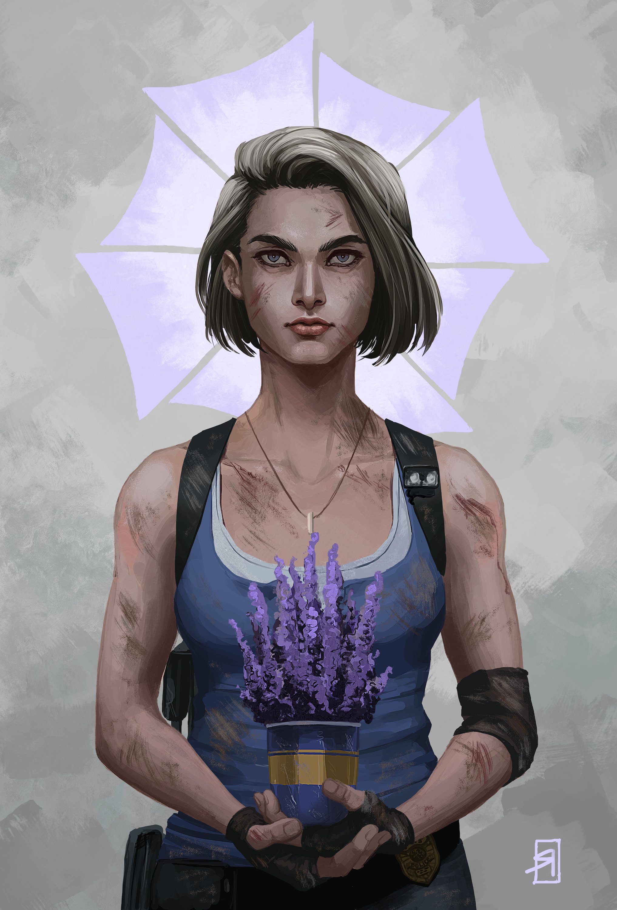 1girl absurdres black_gloves blue_eyes blue_shirt brown_hair bruise bruise_on_arm dirty dirty_clothes dirty_face elbow_pads fingerless_gloves gloves grey_background highres injury jewelry jill_valentine looking_at_viewer necklace plant potted_plant princerevenant resident_evil resident_evil_3:_nemesis resident_evil_3_(remake) shirt short_hair signature single_elbow_pad