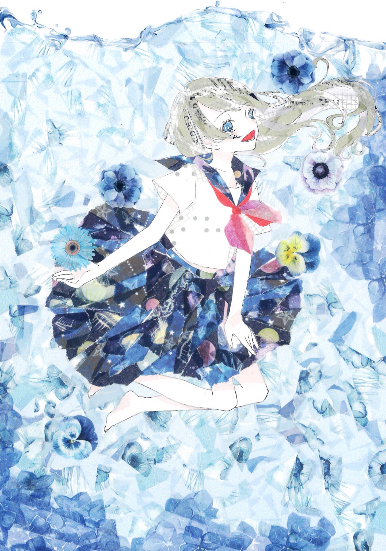 1girl 922pochan :d abstract abstract_background bare_legs barefoot blonde_hair blue_background blue_eyes blue_sailor_collar blue_skirt flower from_side full_body highres long_hair lower_teeth_only masking_tape_(medium) medium_skirt mixed_media neckerchief open_mouth original red_neckerchief sailor_collar sailor_shirt shirt short_sleeves sidelocks skirt smile solo swept_bangs teeth traditional_media unconventional_media white_shirt