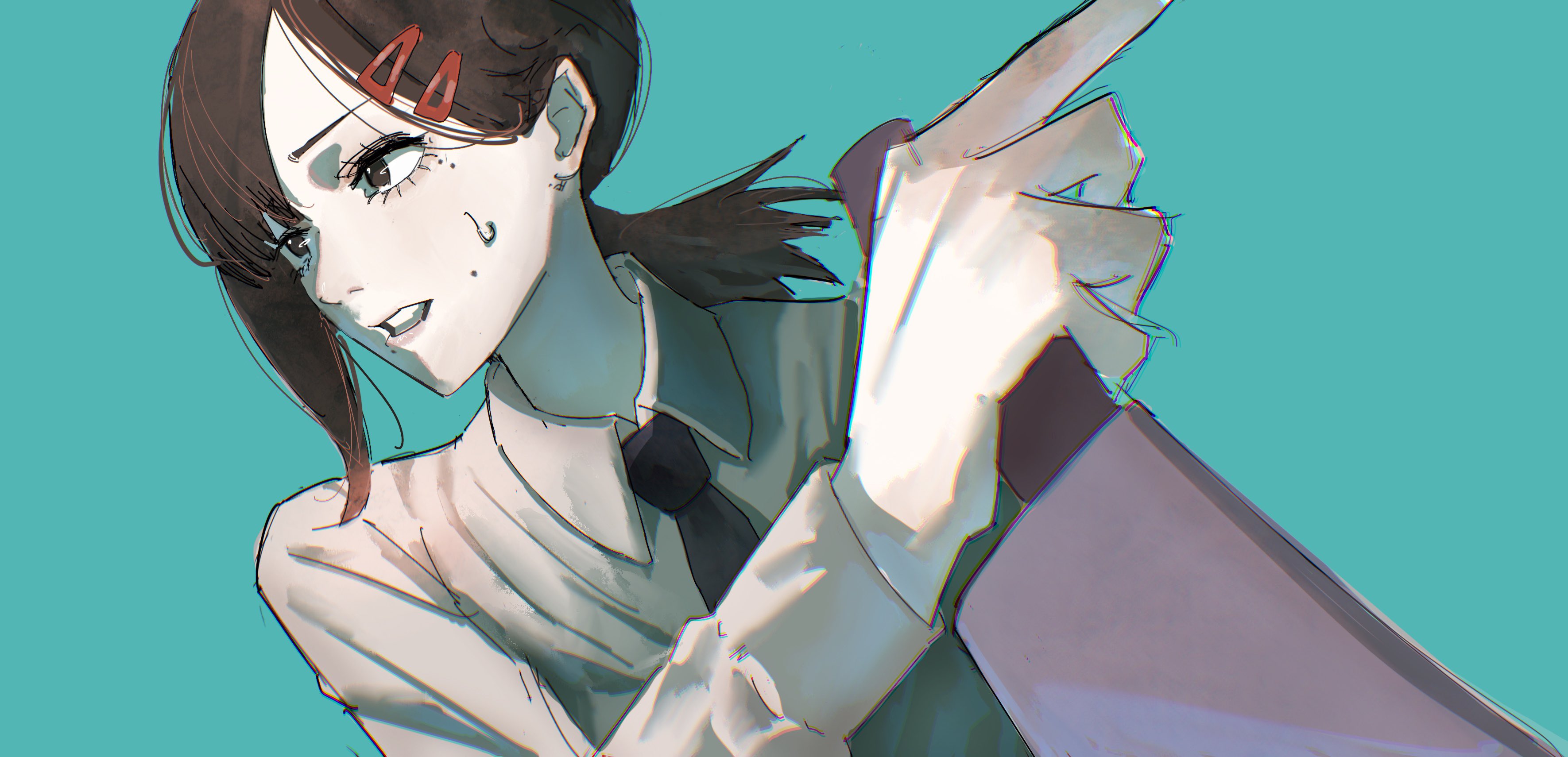 1girl absurdres black_necktie blue_background brown_eyes brown_hair chainsaw_man cheshire_nek collared_shirt commentary_request hair_ornament hairclip higashiyama_kobeni highres holding holding_knife kitchen_knife knife mole mole_under_eye necktie shirt solo sweatdrop white_shirt