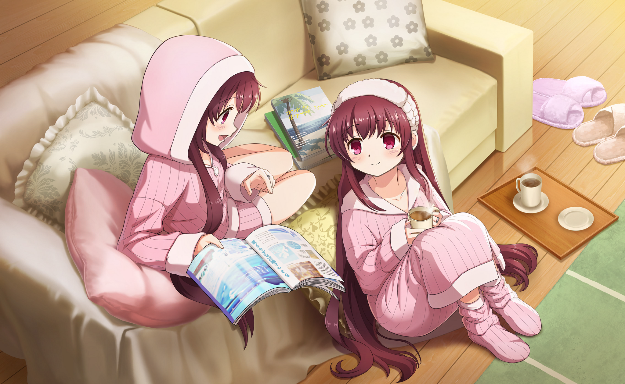 2girls amane_tsukasa amane_tsukuyo artist_request bare_legs brown_hair brown_slippers carpet closed_mouth coffee collarbone couch cup dot_nose dress empty_eyes fingernails full_body fur_hairband game_cg hair_over_shoulder hair_spread_out hairband happy highres holding holding_cup holding_magazine hood hood_down hood_up hooded_dress indoors jewelry knees_up light_blush long_dress long_hair long_sleeves looking_at_another magazine_(object) magia_record:_mahou_shoujo_madoka_magica_gaiden mahou_shoujo_madoka_magica mahou_shoujo_madoka_magica_magia_exedra mug multiple_girls nightgown official_art on_couch open_mouth pajamas pillow pink_dress pink_eyes pink_pajamas pink_slippers pink_socks ring short_dress siblings sisters sitting sleeves_past_wrists slippers smile socks steam tareme third-party_source twins unworn_slippers very_long_hair white_hairband wooden_floor