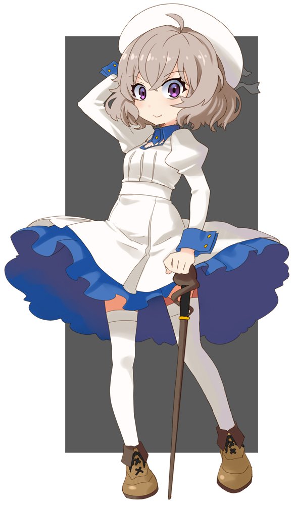 1girl ahoge boots cane commentary_request dress full_body grey_hair hat iwanaga_kotoko katahira_masashi kyokou_suiri looking_at_viewer purple_eyes short_hair smile solo thighhighs white_dress white_thighhighs zettai_ryouiki