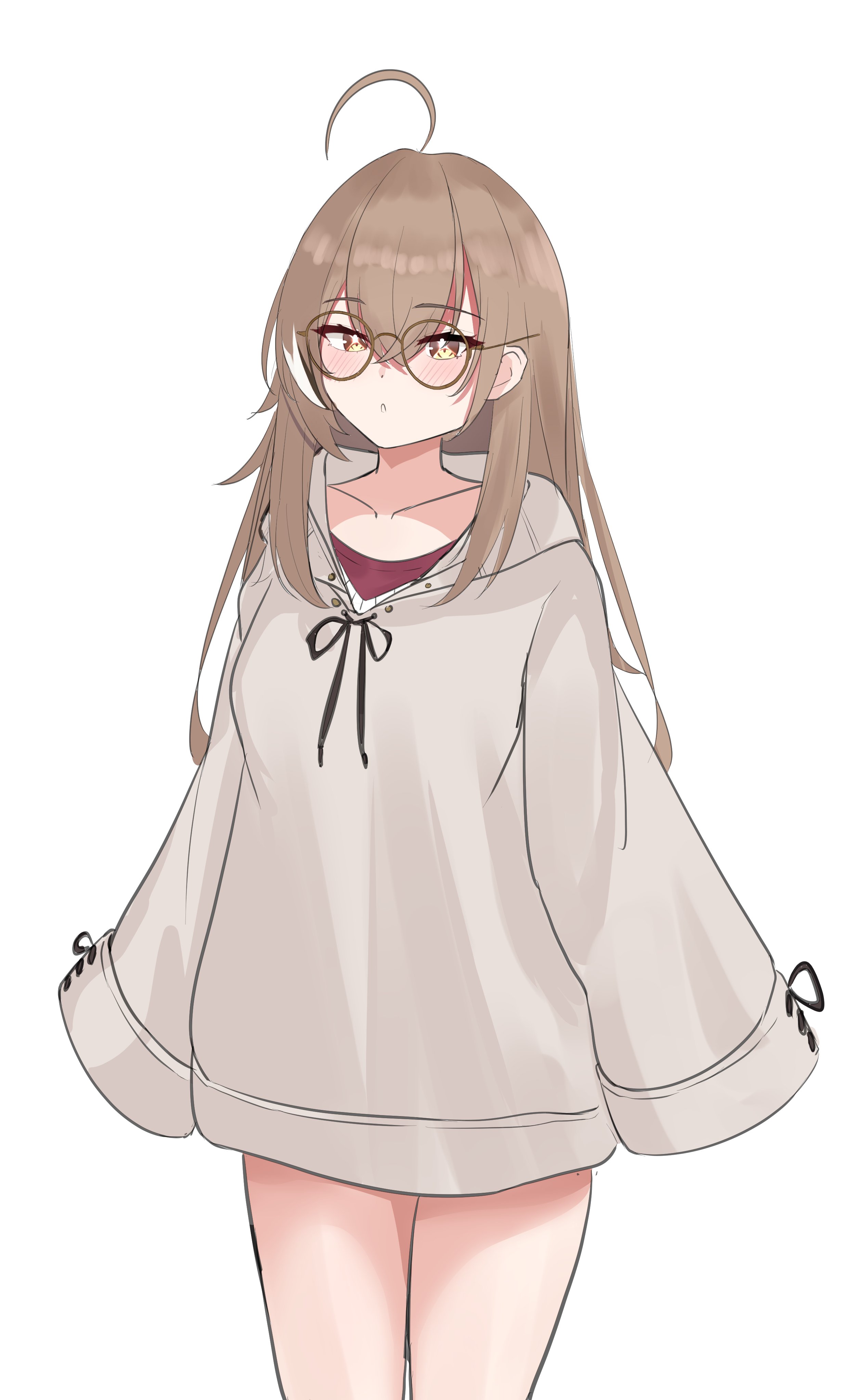 1girl absurdres ahoge black-framed_eyewear black_hair blush brown_eyes brown_hair brown_hoodie closed_mouth glasses highres hololive hololive_english hood hoodie long_hair looking_at_viewer multicolored_hair nanashi_mumei nanashi_mumei_(casual) official_alternate_costume sasaki_ikuya sleeves_past_fingers sleeves_past_wrists streaked_hair virtual_youtuber
