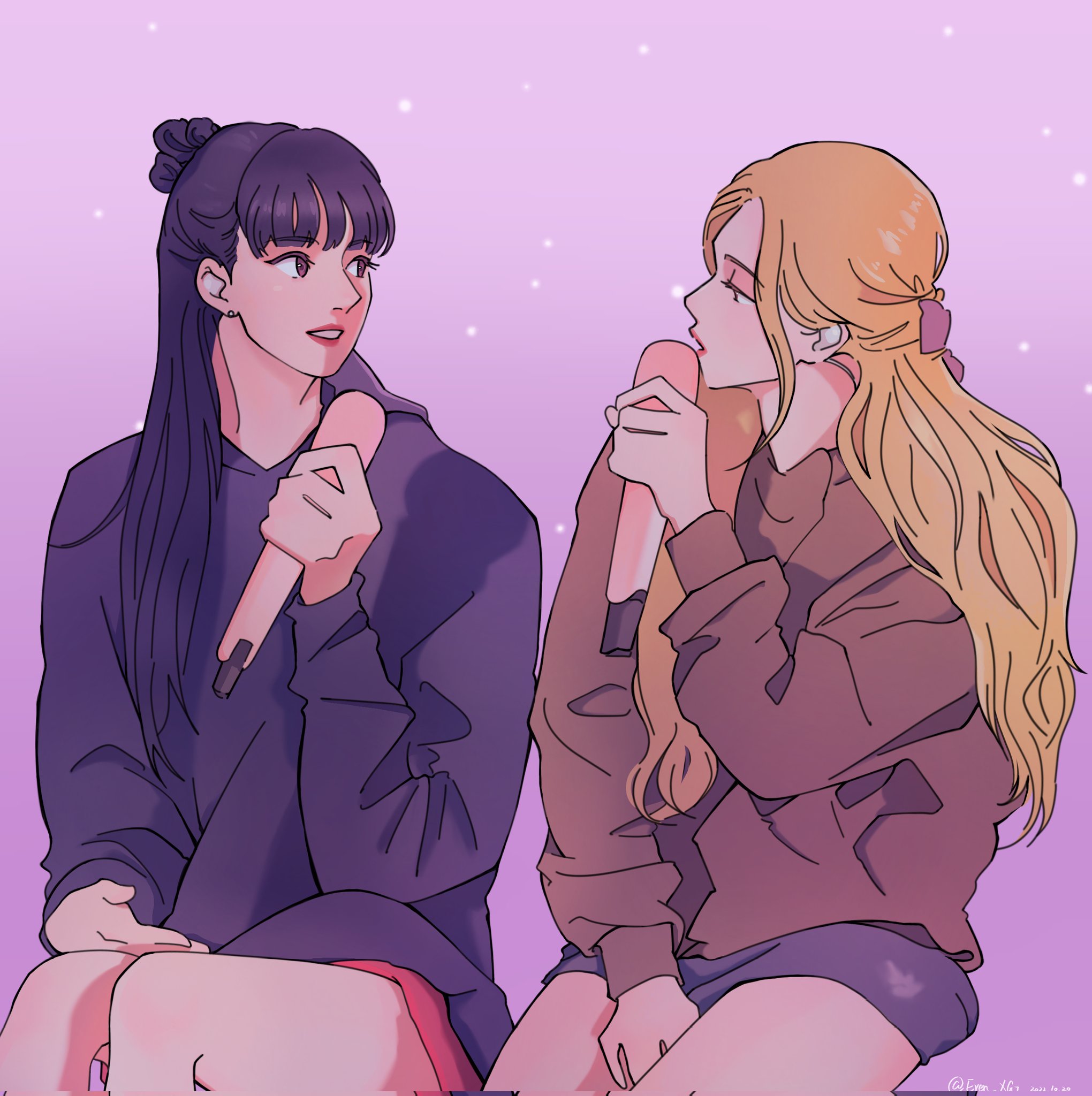 2girls black_hair blackpink blonde_hair blunt_bangs commentary eren_xg7 eye_contact hair_bun half_updo highres holding holding_microphone hood hoodie k-pop lisa_(blackpink) long_hair looking_at_another microphone multiple_girls real_life rose_(blackpink) simple_background