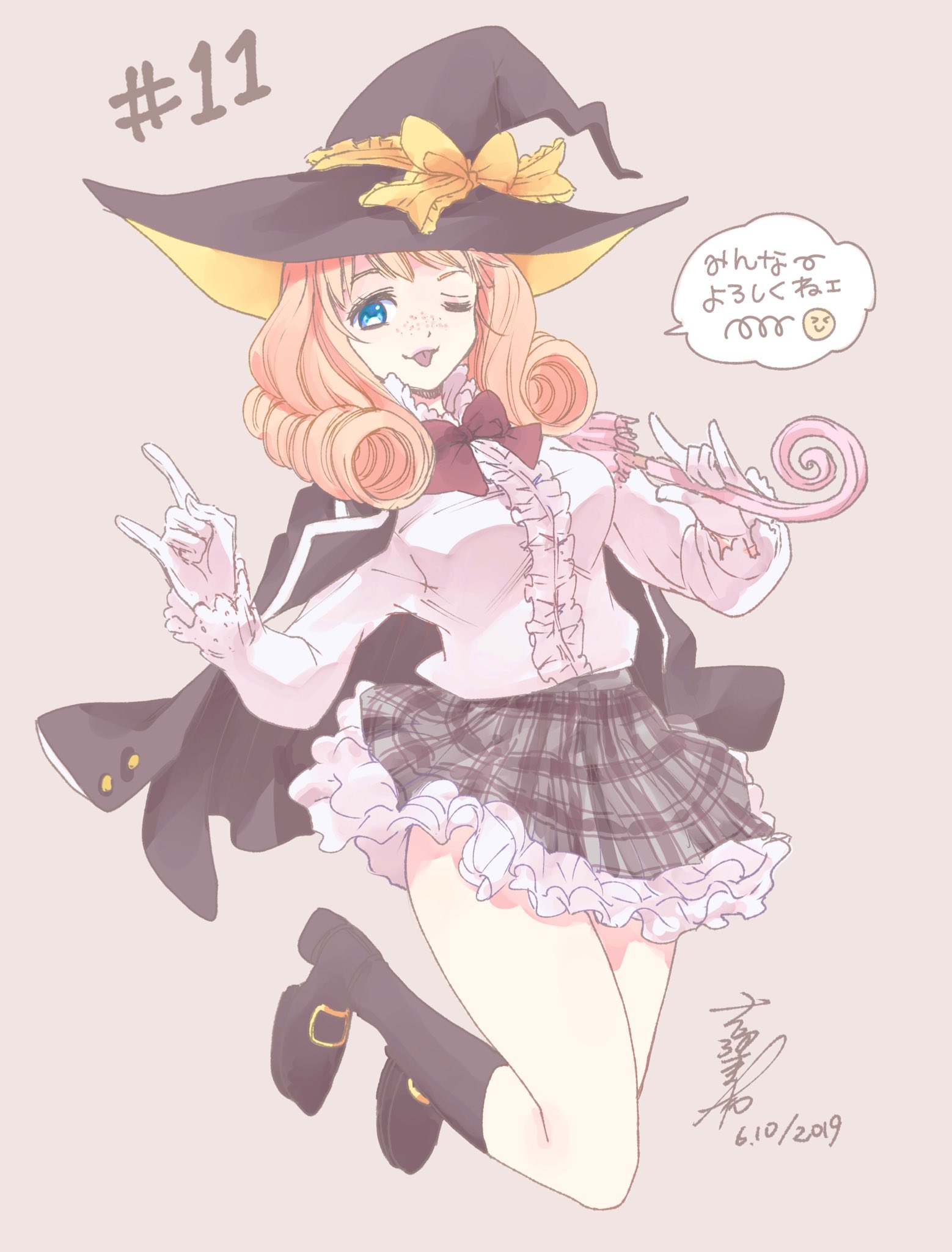 1girl \n/ black_jacket black_shoes blue_eyes bow bowtie breasts brown_background center_frills commentary_request dated freckles frilled_skirt frills full_body gloves hat hat_bow highres holding holding_umbrella jacket jacket_on_shoulders kneehighs long_hair long_sleeves looking_at_viewer orange_hair plaid_clothes plaid_skirt red_bow red_bowtie saionji_rika shoes signature simple_background skirt smile socks solo tongue tongue_out umbrella white_gloves witch_hat yamada-kun_to_7-nin_no_majo yellow_bow yoshikawa_miki