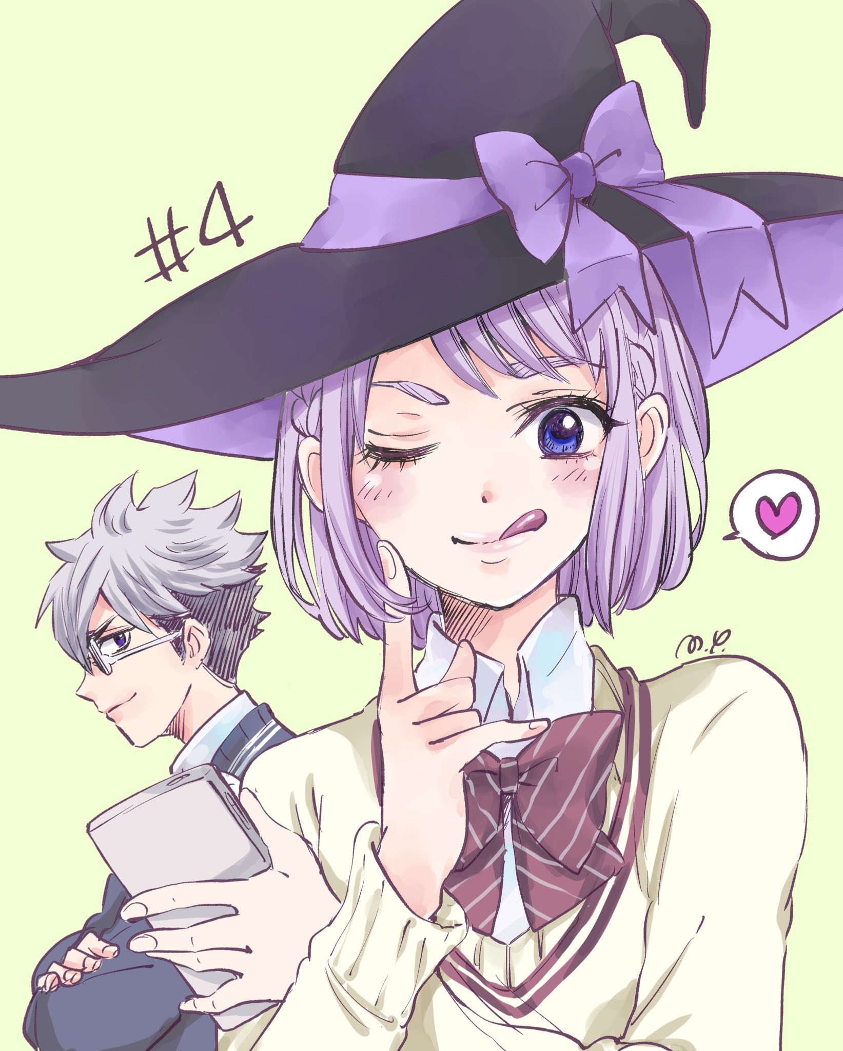 1boy 1girl :q black_hat blue_eyes bow collared_shirt commentary_request crossed_arms glasses green_background grey_hair hat hat_bow heart highres igarashi_ushio long_sleeves odagiri_nene purple_bow purple_hair red_bow shirt short_hair sidelocks signature simple_background smile spoken_heart sweater tongue tongue_out upper_body white_shirt witch_hat yamada-kun_to_7-nin_no_majo yellow_sweater yoshikawa_miki