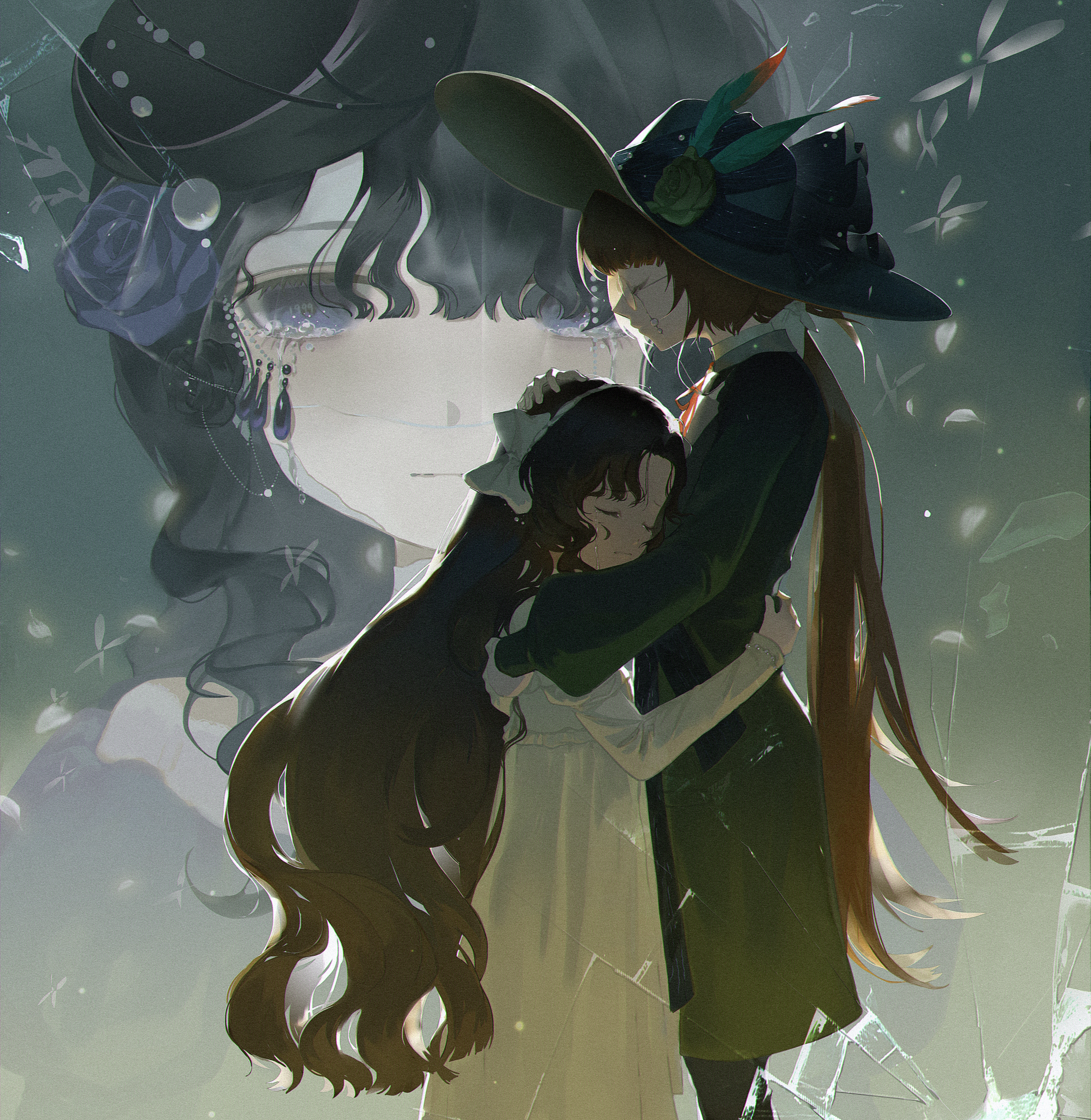 2girls absurdres aged_down arms_around_another's_waist backlighting black_hair black_hat brown_hair closed_eyes closed_mouth crying dress eyewear_strap feathers flower from_side glasses green_feathers green_hat green_jacket grey_background hair_flower hair_ornament hand_on_another's_back hand_on_another's_head hat hat_feather hat_flower highres hug isolde_(reverse:1999) jacket kakania_(reverse:1999) long_hair long_sleeves low_ponytail momo369597 multiple_girls multiple_views picture_hat ponytail purple_eyes purple_flower reverse:1999 streaming_tears tears time_paradox very_long_hair white_dress