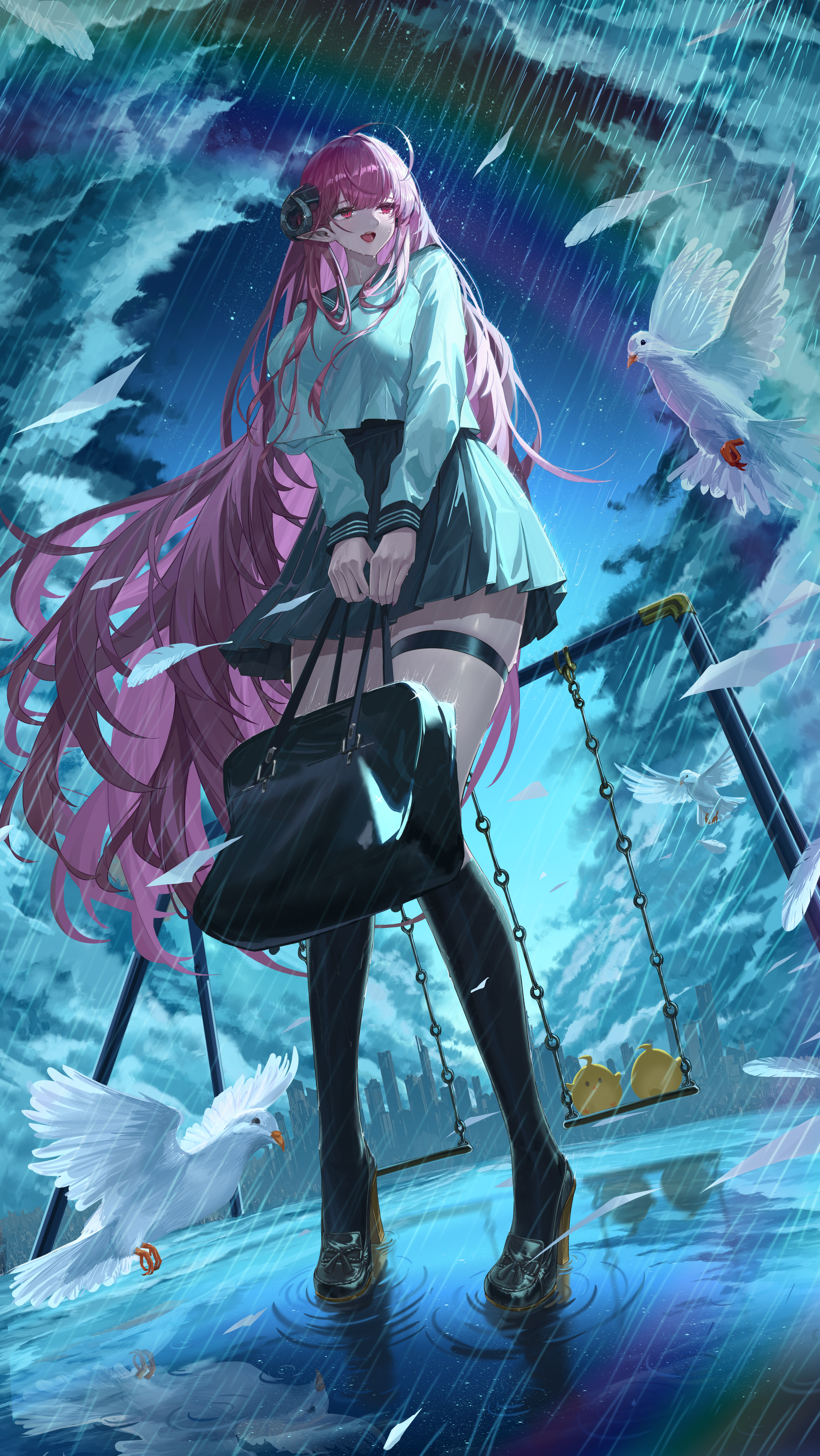 1girl absurdres alternate_costume azur_lane bag bird black_bag black_horns black_serafuku black_thighhighs boots breasts curled_horns demon_girl demon_horns dove falling_feathers feathers highres hindenburg_(azur_lane) horns long_hair manjuu_(azur_lane) neckerchief nick_laojiao night original outdoors overcast platform_boots platform_heels pleated_skirt pointy_ears puddle rain red_eyes red_hair sailor_collar school_bag school_uniform serafuku skirt sky skyline solo star_(sky) starry_sky swing_set thigh_strap thighhighs very_long_hair white_bird