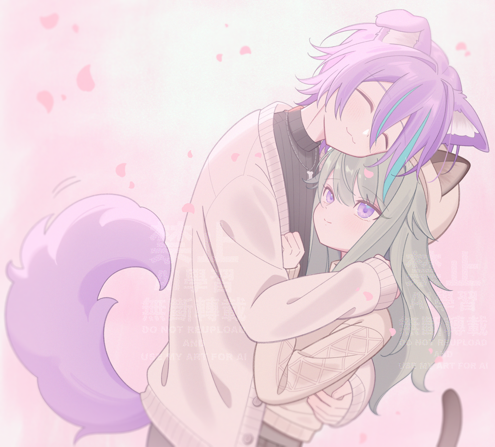 1boy 1girl :3 ^_^ animal_ears black_sweater blue_streaks blurry bone_necklace brown_tail cardigan casual cat_ears cat_girl cat_tail chin_rest closed_eyes closed_mouth commentary_request couple depth_of_field dog_boy dog_ears dog_tail ears_through_headwear falling_petals green_hair hand_on_another's_chest hand_on_another's_shoulder hand_on_another's_waist happy hat head_on_head head_rest height_difference hetero highres hug ire_(vampirero) kamishiro_rui kemonomimi_mode kusanagi_nene light_smile long_hair looking_at_another looking_up motion_lines multicolored_hair mutual_hug open_cardigan open_clothes petals pink_background pink_petals project_sekai purple_eyes purple_hair purple_tail short_hair smile streaked_hair sweater tail tail_raised two-tone_hair upper_body very_short_hair watermark white_cardigan white_hat