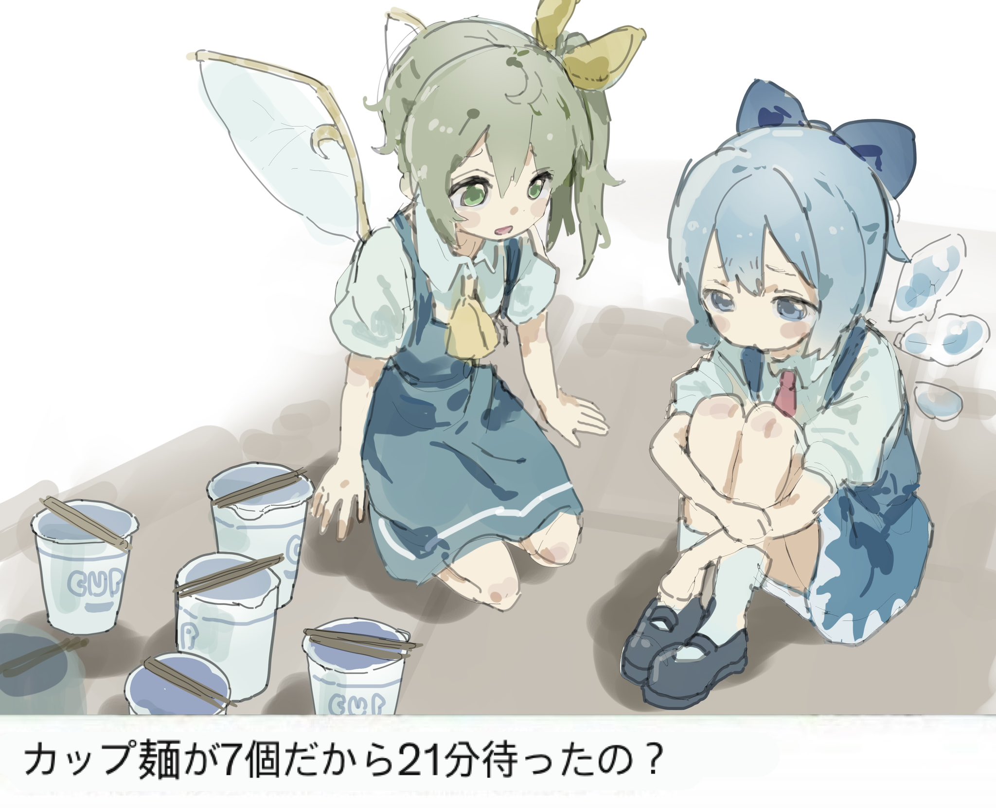 2girls black_shoes blue_bow blue_dress blue_eyes blue_hair bow cirno cup instant_cup_noodles daiyousei dress fairy fairy_wings full_body green_eyes green_hair hair_between_eyes highres hugging_own_legs ice ice_wings instant_noodles looking_at_another multiple_girls neckerchief open_mouth red_neckerchief ribbon sad seiza sesmkun shirt shoes short_sleeves sitting socks touhou white_shirt white_socks wings yellow_neckerchief yellow_ribbon