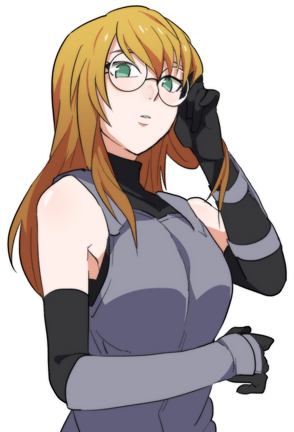 1girl bad_id bad_pixiv_id bare_shoulders black_gloves blonde_hair elbow_gloves glasses gloves green_eyes grey_vest konohagakure_anbu_uniform long_hair looking_at_viewer naruto_(series) naruto_shippuuden ninja roko_(abekawa) round_eyewear simple_background solo upper_body vest white_background yakushi_nonou