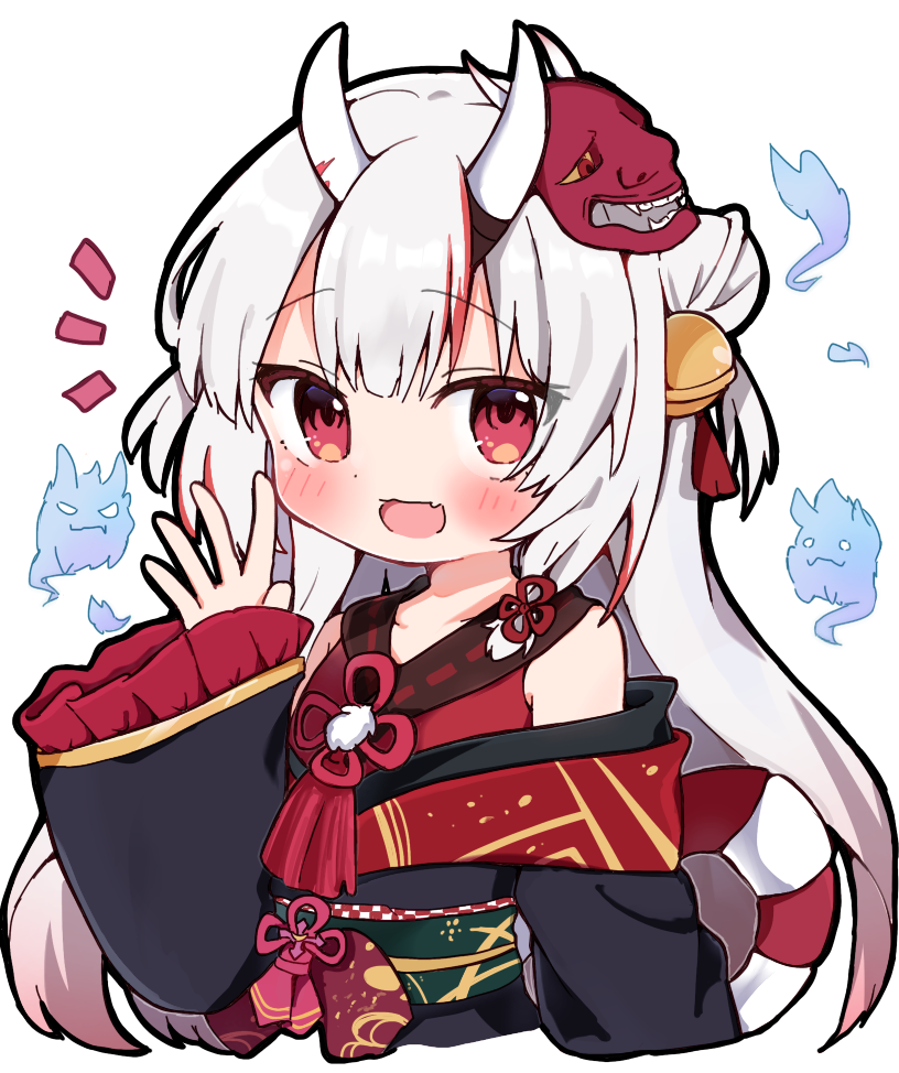 1girl bell black_kimono blush fang gradient_hair hair_bell hair_bun hair_ornament hololive horns japanese_clothes jingle_bell karma_(nakiri_ayame) kimono mask multicolored_hair nakiri_ayame nakiri_ayame_(1st_costume) oni oni_mask rabiiandrain red_eyes red_hair red_kimono shiranui_(nakiri_ayame) skin-covered_horns skin_fang sleeveless sleeveless_kimono smile solo streaked_hair virtual_youtuber waving white_hair