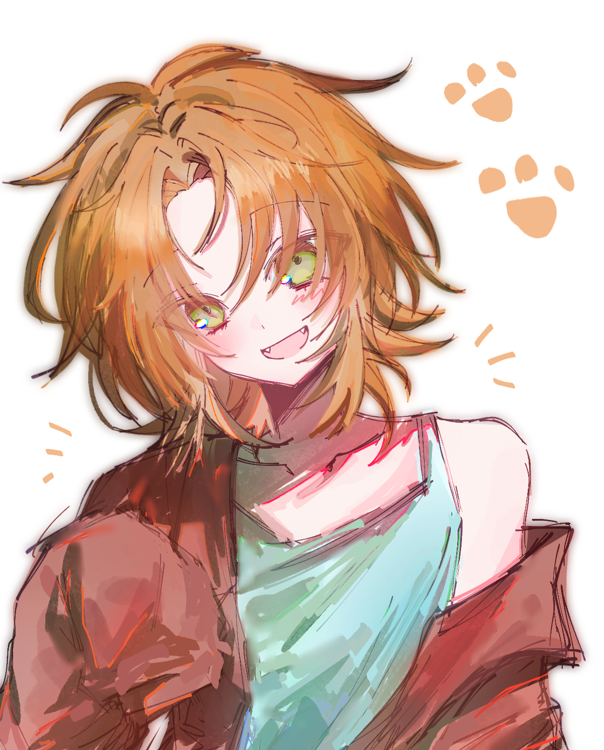 1boy blue_tank_top brown_hair brown_jacket chinese_commentary collarbone commentary_request curtained_hair eyes_visible_through_hair fangs green_eyes hand_up happy_aura highres jacket long_sleeves male_focus open_clothes open_jacket open_mouth parted_bangs paw_print saibou_shinkyoku shinano_eiji short_hair simple_background single_bare_shoulder sleeves_past_fingers sleeves_past_wrists smile solo tank_top tsurime upper_body white_background zhi2490178
