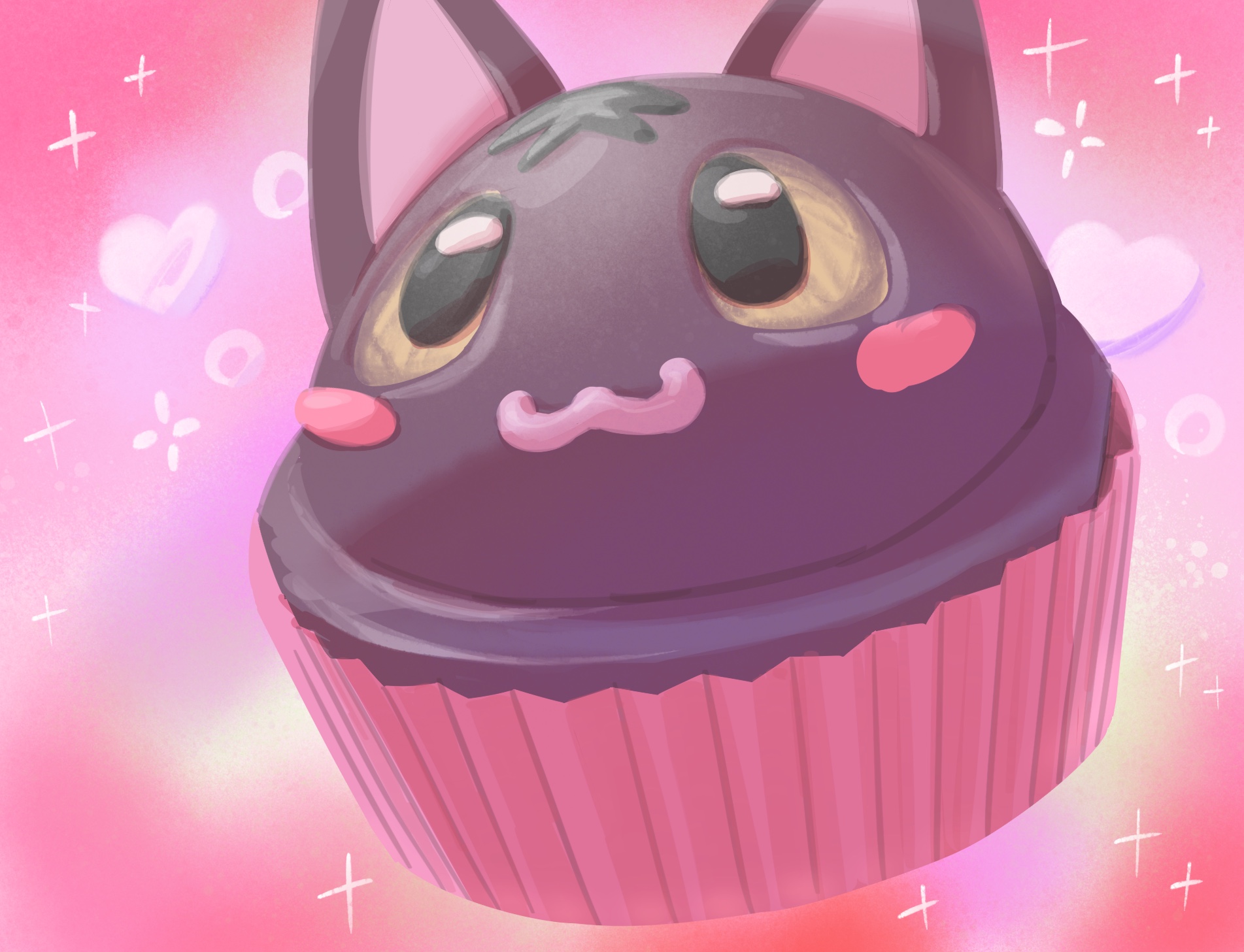 :3 animal_crossing blush_stickers cat character-themed_food commentary_request cupcake dessert food food_focus heart highres kopa_nishikida nintendo no_humans pink_theme rosie_(animal_crossing) sparkle sweets