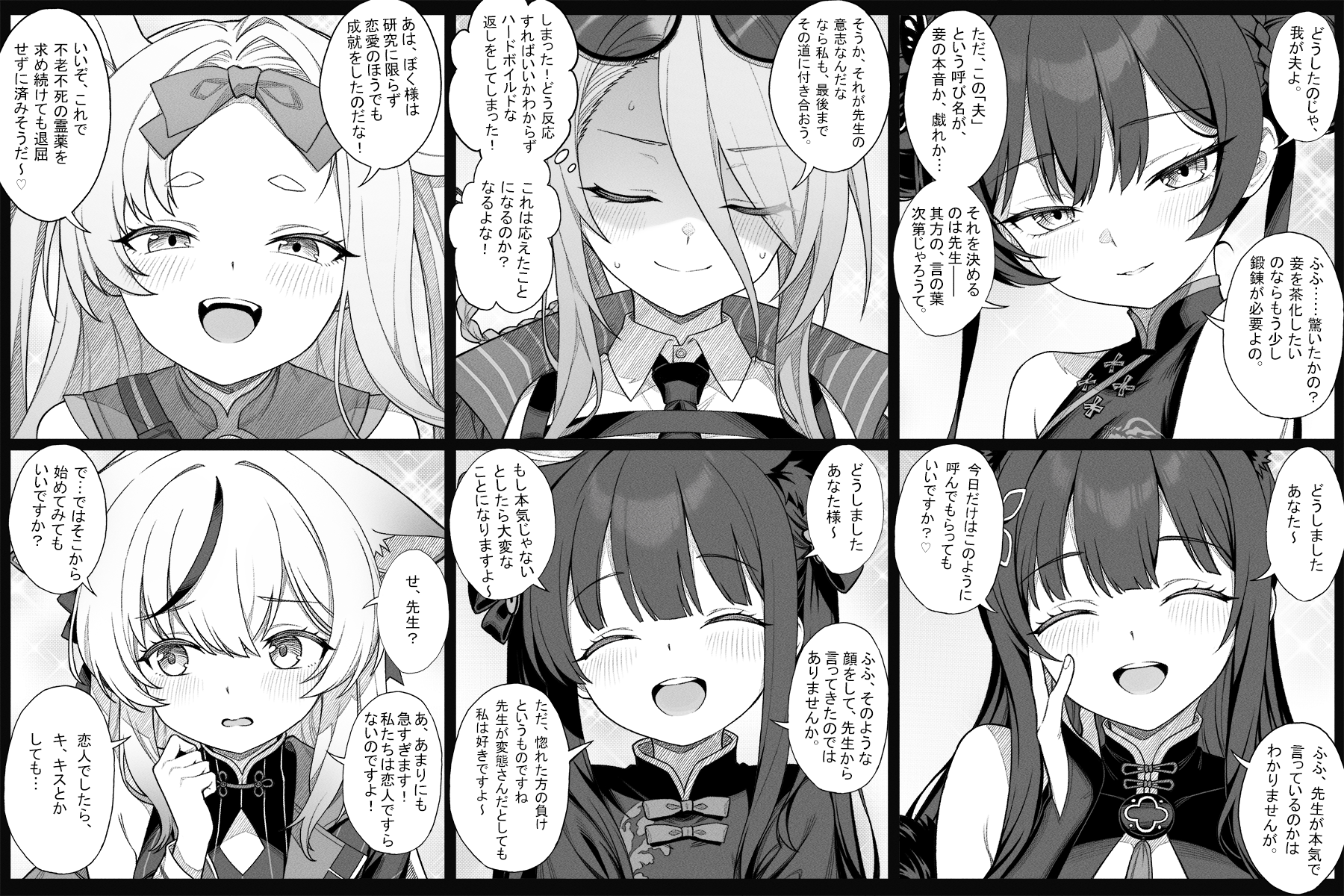 6+girls animal_ear_fluff animal_ears bare_shoulders blue_archive blush bow china_dress chinese_clothes closed_eyes closed_mouth dress eyewear_on_head greyscale hair_between_eyes hair_bow highres jacket kisaki_(blue_archive) kokona_(blue_archive) long_bangs long_hair looking_at_viewer looking_to_the_side mina_(blue_archive) monochrome mouse_ears mouse_girl multiple_girls necktie open_mouth party saya_(blue_archive) shaded_face shirt shun_(blue_archive) shun_(small)_(blue_archive) sidelocks sleeveless sleeveless_dress smile striped_clothes striped_jacket sunglasses sweatdrop teeth tiger_ears tiger_girl translated upper_teeth_only vertical-striped_clothes vertical-striped_jacket zhong_zi_sheliu