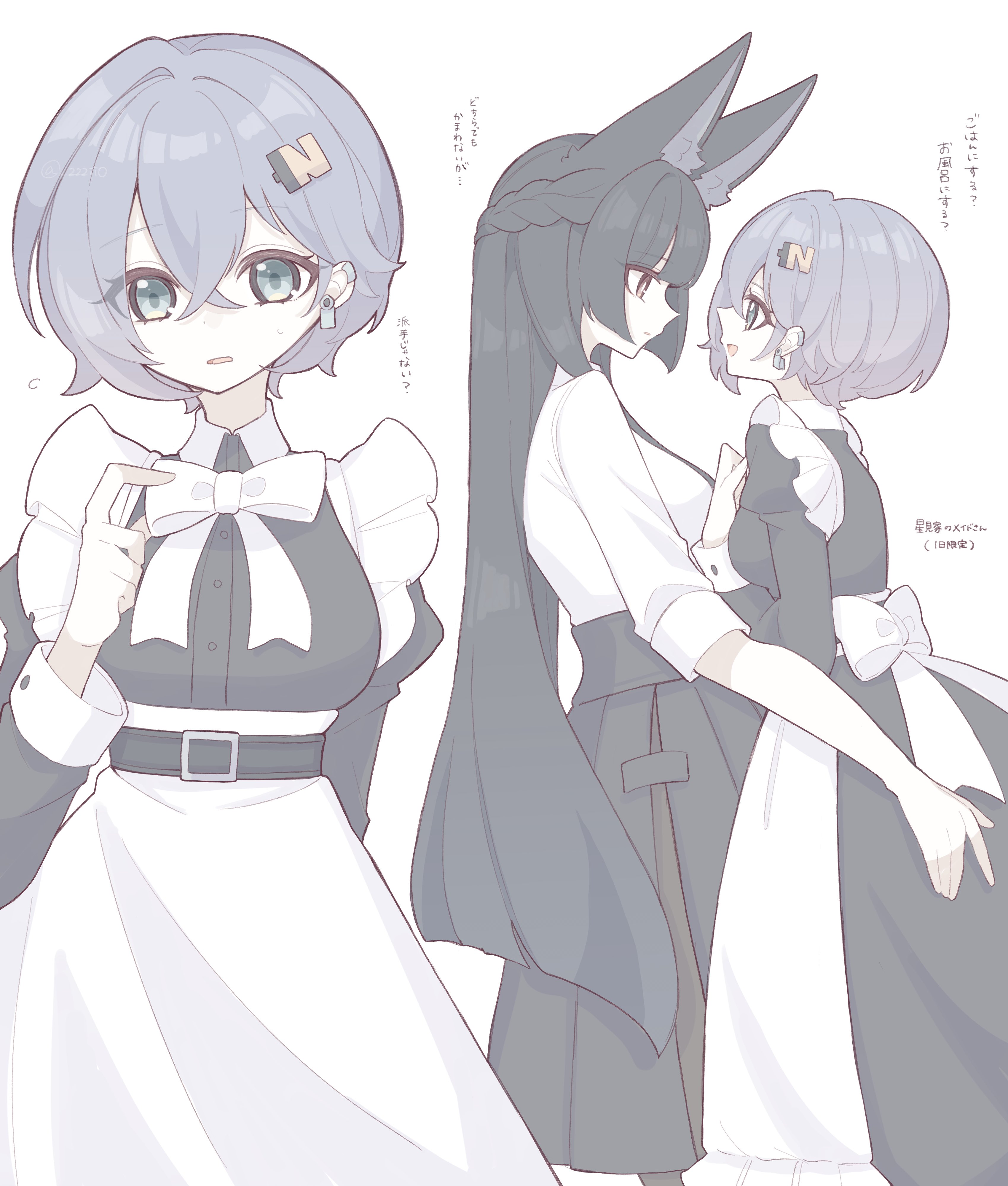2girls absurdres alternate_costume animal_ear_fluff animal_ears belle_(zenless_zone_zero) black_dress black_necktie black_skirt blue_hair blunt_bangs bow bowtie collared_shirt dress enmaided fox_ears fox_girl green_eyes hair_between_eyes hair_ornament high-waist_skirt highres hoshimi_miyabi letter_hair_ornament long_hair looking_at_another maid multiple_girls necktie red_eyes shirt skirt sleeves_rolled_up white_bow white_bowtie zenless_zone_zero zzzii0
