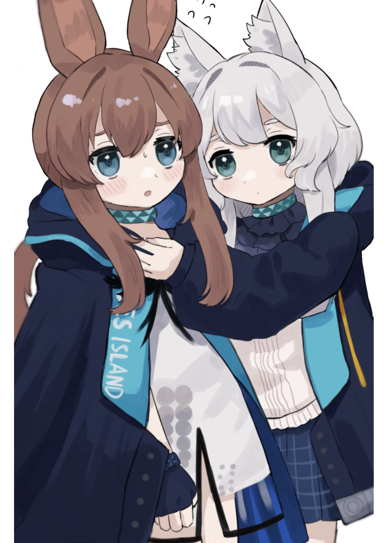 2girls :o amiya_(arknights) amiya_(arknights)_(cosplay) animal_ears arknights ascot blue_eyes blush brown_hair cat_ears cat_girl cloak closed_mouth commentary_request cosplay costume_switch cropped dress eyebrows_hidden_by_hair flying_sweatdrops grey_hair highres hood hood_down hooded_cloak hooded_jacket hug jacket long_hair miniskirt multiple_girls parted_lips ponytail rabbit_ears rabbit_girl rosmontis_(arknights) rosmontis_(arknights)_(cosplay) short_eyebrows skirt someyaya thick_eyebrows very_long_hair white_dress