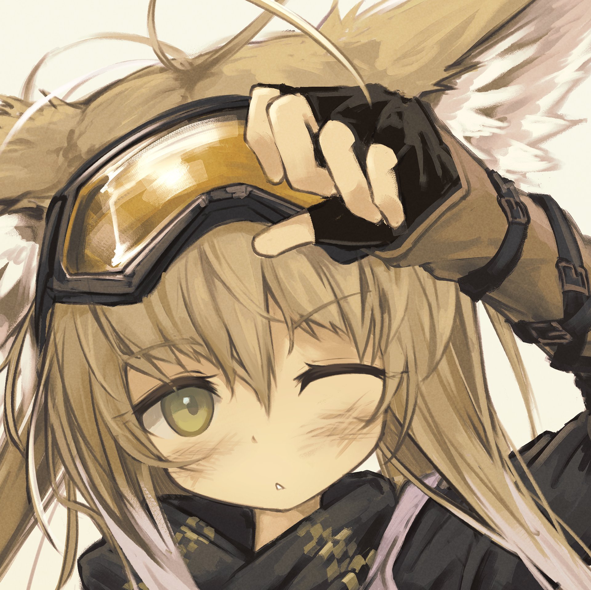 1girl animal_ears arknights cropped dirty dirty_face fingerless_gloves fox_ears fox_girl gloves goggles goggles_on_head highres lit_ter official_alternate_costume one_eye_closed solo suzuran_(arknights) suzuran_(lostlands_flowering)_(arknights)