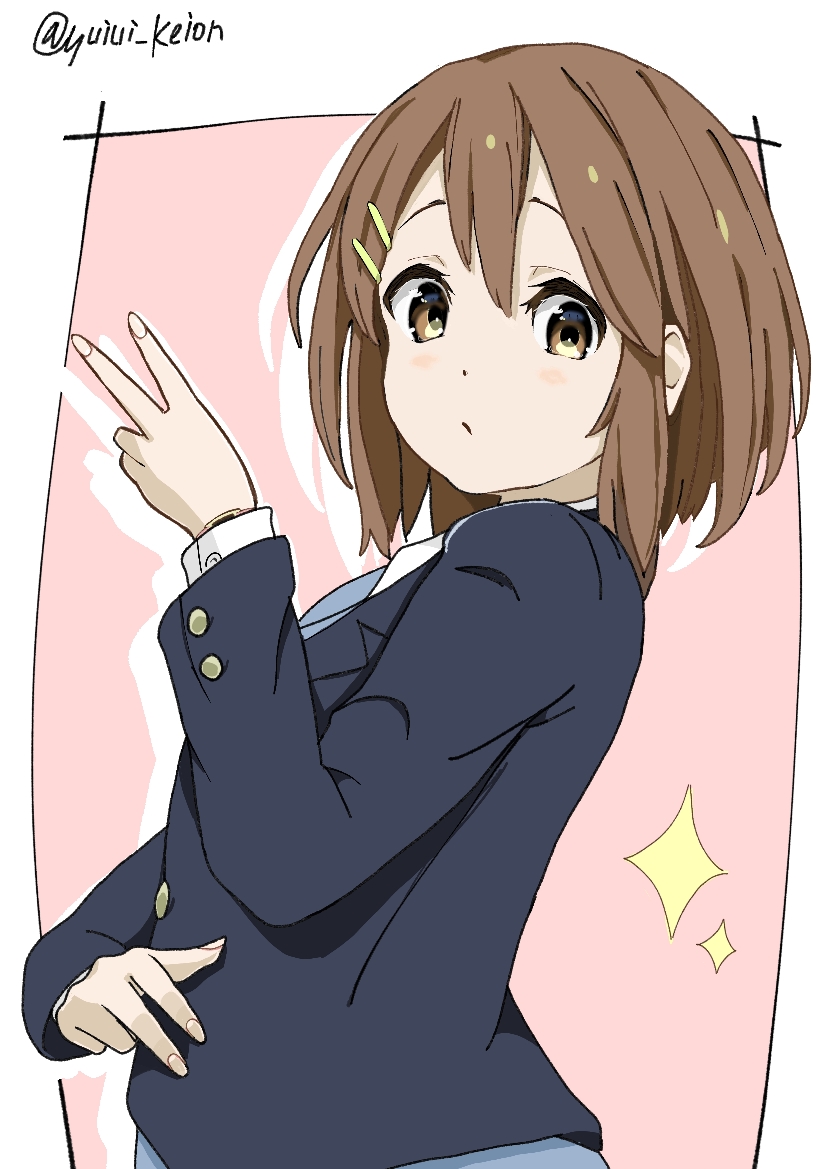 1girl blazer blue_jacket brown_eyes brown_hair hair_ornament hairclip hirasawa_yui jacket k-on! long_sleeves looking_at_viewer medium_hair sakuragaoka_high_school_uniform school_uniform sketch solo straight_hair twitter_username yuiui_keion