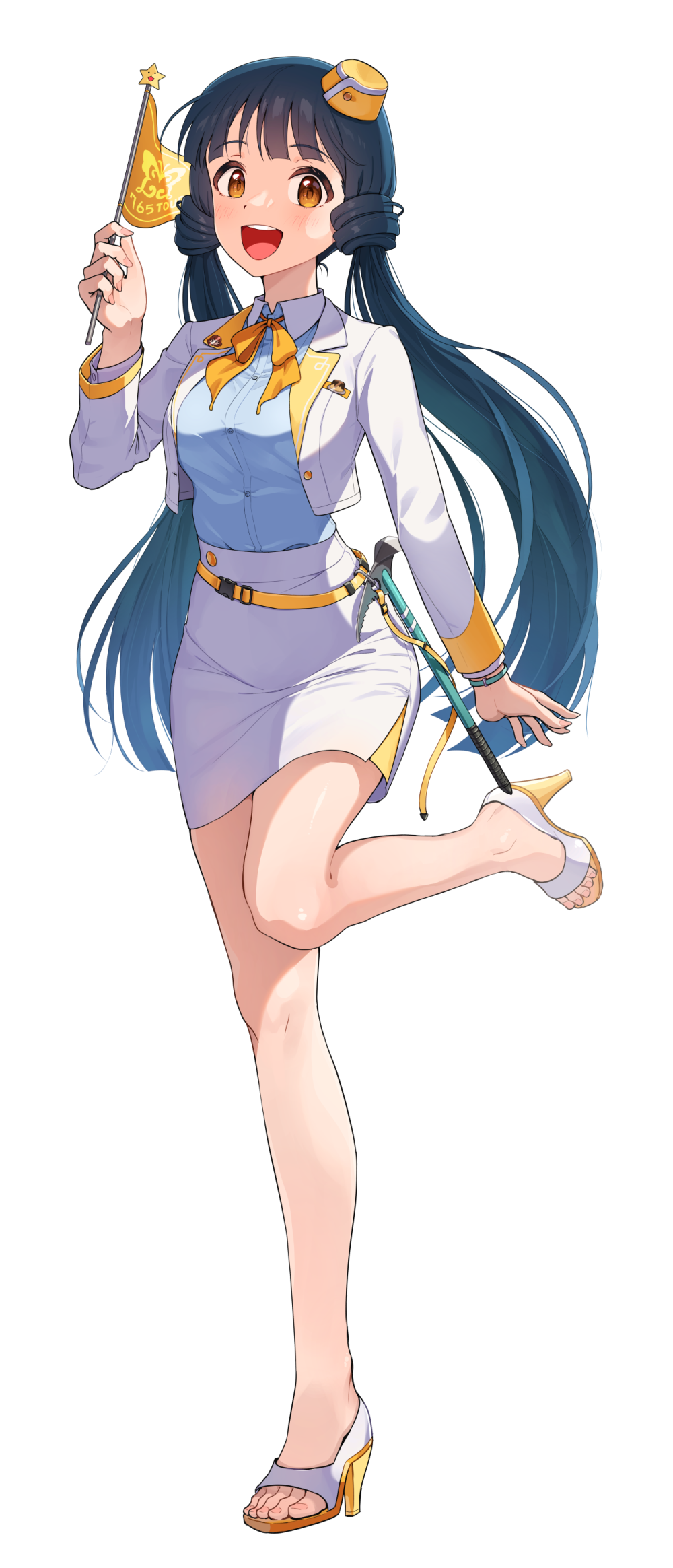 1girl blazer blue_hair blue_shirt bow bowtie breasts brown_eyes collared_shirt cropped_jacket flag full_body high_heel_sandals high_heels highres holding holding_flag ice_axe idolmaster idolmaster_million_live! idolmaster_million_live!_theater_days jacket kamille_(vcx68) kitakami_reika long_hair looking_at_viewer medium_breasts open_mouth orange_bow orange_bowtie pencil_skirt sandals shirt skirt solo standing standing_on_one_leg teeth twintails upper_teeth_only very_long_hair white_background