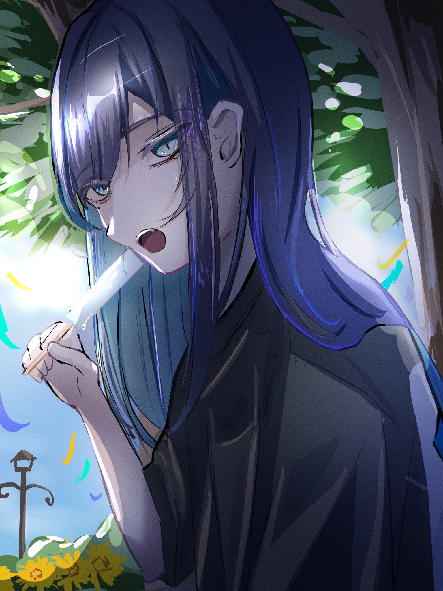 1girl ado_(utaite) black_shirt blue_eyes blue_hair chando_(ado) commentary_request day food highres holding holding_food holding_popsicle long_hair looking_at_viewer megu_(9abgoluanvcjd7o) mole mole_under_eye open_mouth outdoors popsicle shirt sidelocks solo teeth tree under_tree upper_teeth_only utaite