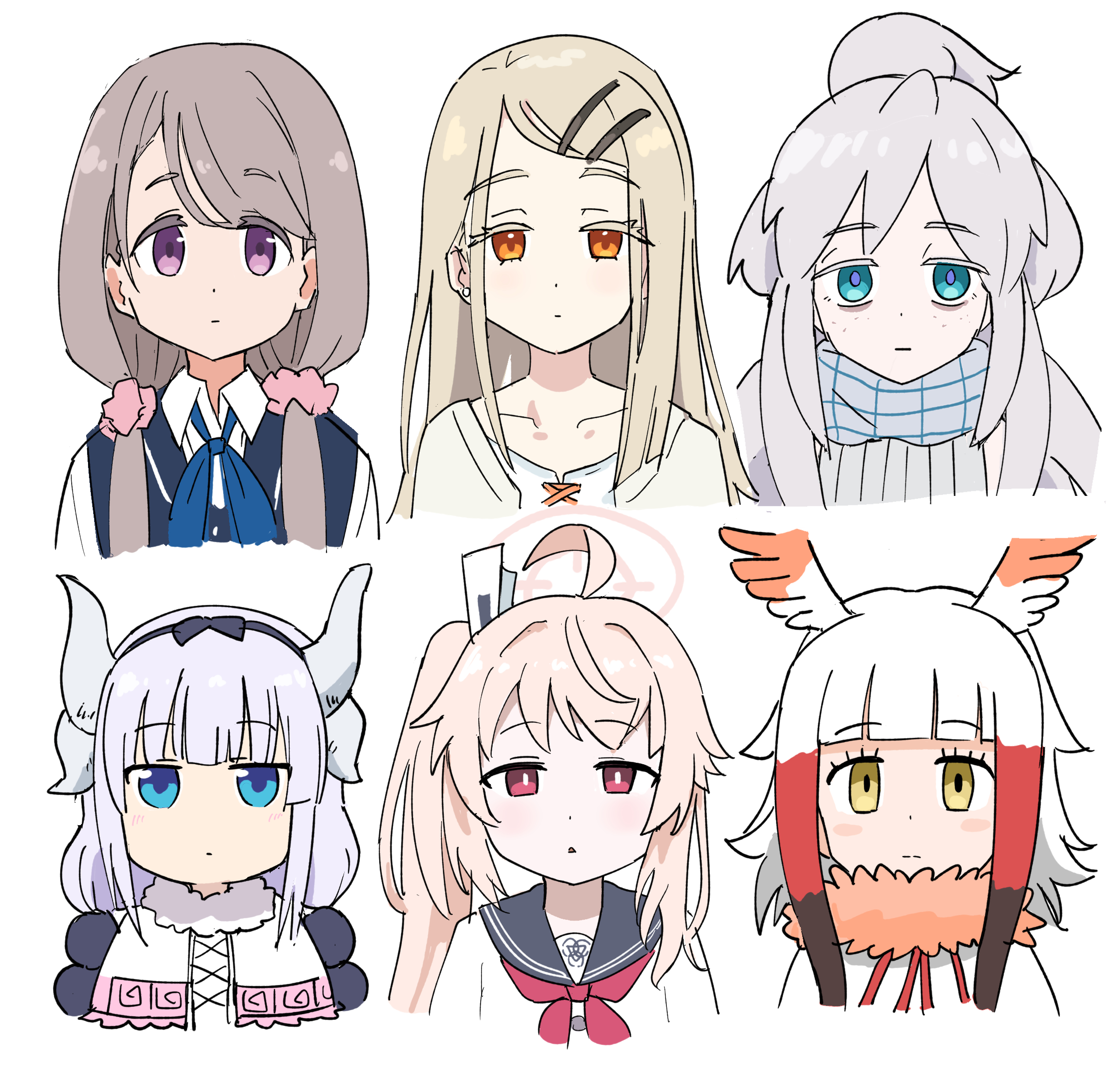 6+girls blonde_hair blue_archive blue_eyes brown_hair commentary deux_murasame gakuen_idolmaster gundam gundam_gquuuuuux hair_ornament highres idolmaster japanese_crested_ibis_(kemono_friends) jitome kanna_kamui kemono_friends kobayashi-san_chi_no_maidragon long_hair mono_(afro) multiple_girls natsu_(blue_archive) orange_eyes pink_hair purple_eyes purple_hair shikishima_sakurako shinosawa_hiro simple_background sphere_hair_ornament tenten_(chan4545) trait_connection white_background white_hair yellow_eyes