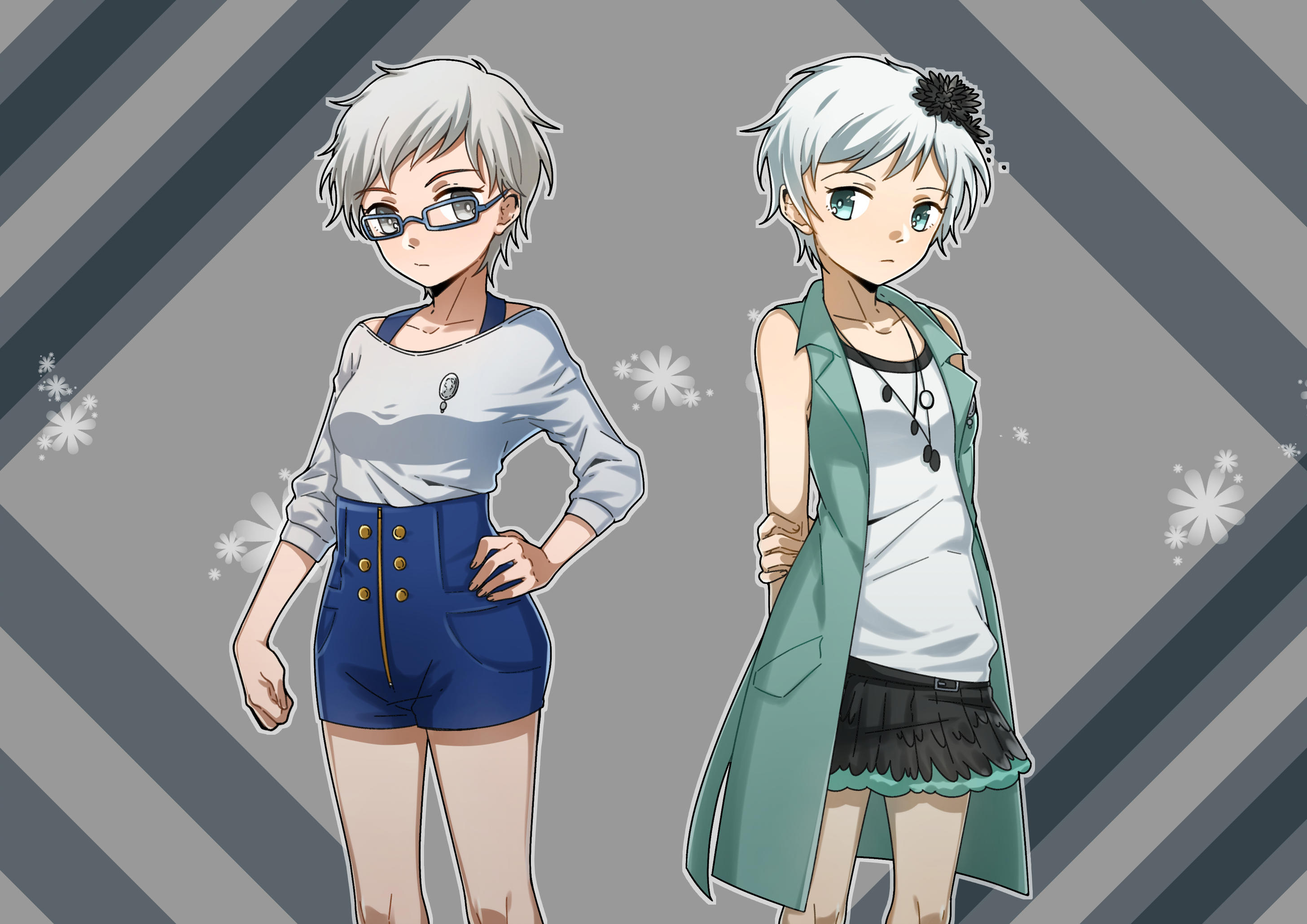 2girls aqua_eyes black_flower black_skirt blue-framed_eyewear blue_jacket blue_shorts brooch closed_mouth commentary cowboy_shot dual_persona english_commentary eyelashes flower glasses grey_eyes hair_flower hair_ornament hand_on_own_arm hand_on_own_hip high-waist_shorts highres jacket jewelry kyokugen_dasshutsu kyokugen_dasshutsu_adv:_zennin_shibou_desu long_sleeves mismatched_eyebrows multiple_girls necklace open_clothes open_jacket outline phi_(kyokugen_dasshutsu) rectangular_eyewear shirt short_hair shorts skirt sleeveless sleeveless_jacket sleeveless_shirt unknown-amelia very_short_hair white_hair white_outline white_shirt zero_escape:_toki_no_dilemma
