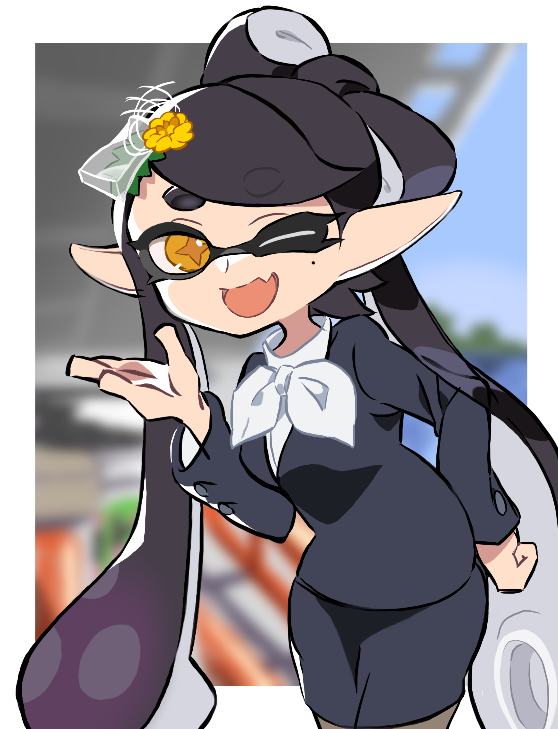 1girl absurdres ao_hito black_hair blurry blurry_background callie_(news_anchor)_(splatoon) callie_(splatoon) cowboy_shot fang formal_clothes hand_on_own_hip highres inkling leaning_forward long_hair looking_at_viewer mole mole_under_eye nintendo official_alternate_costume one_eye_closed open_mouth pantyhose pointy_ears scarf skin_fang skirt smile solo splatoon_(series) suit tentacle_hair twintails yellow_eyes