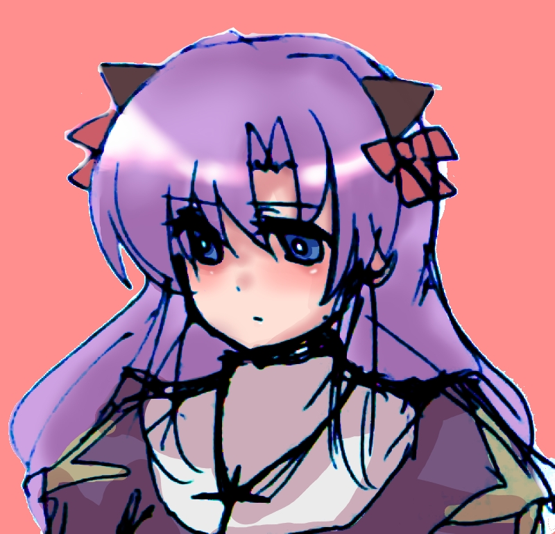 1girl animal_ears blue_eyes blush bow cat_ears cat_girl closed_mouth commentary_request cross cross_necklace dress expressionless hair_bow jewelry juliet_sleeves long_hair long_sleeves looking_at_viewer necklace pink_background priest_(ragnarok_online) puffy_sleeves purple_dress purple_hair ragnarok_online red_bow shomu_(arujanainon) simple_background solo upper_body