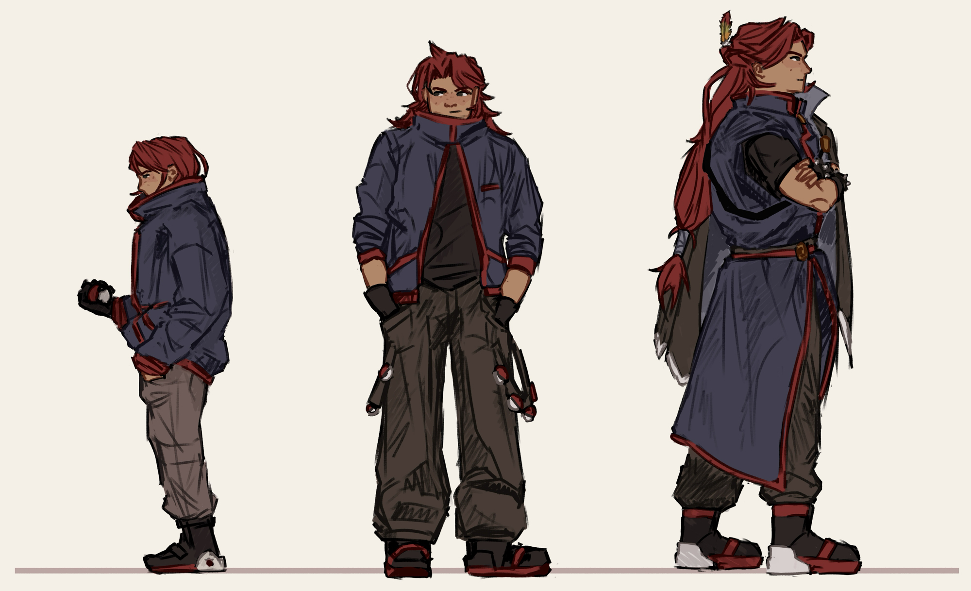 age_progression aged_up cowlick feather_hair_ornament feathers freckles from_side hair_ornament highres holding holding_poke_ball long_coat long_hair low-tied_long_hair nintendo poke_ball poke_ball_(basic) pokemon pokemon_gold/silver/crystal red_hair silver_(pokemon) smile thenorthernstar very_long_hair white_background