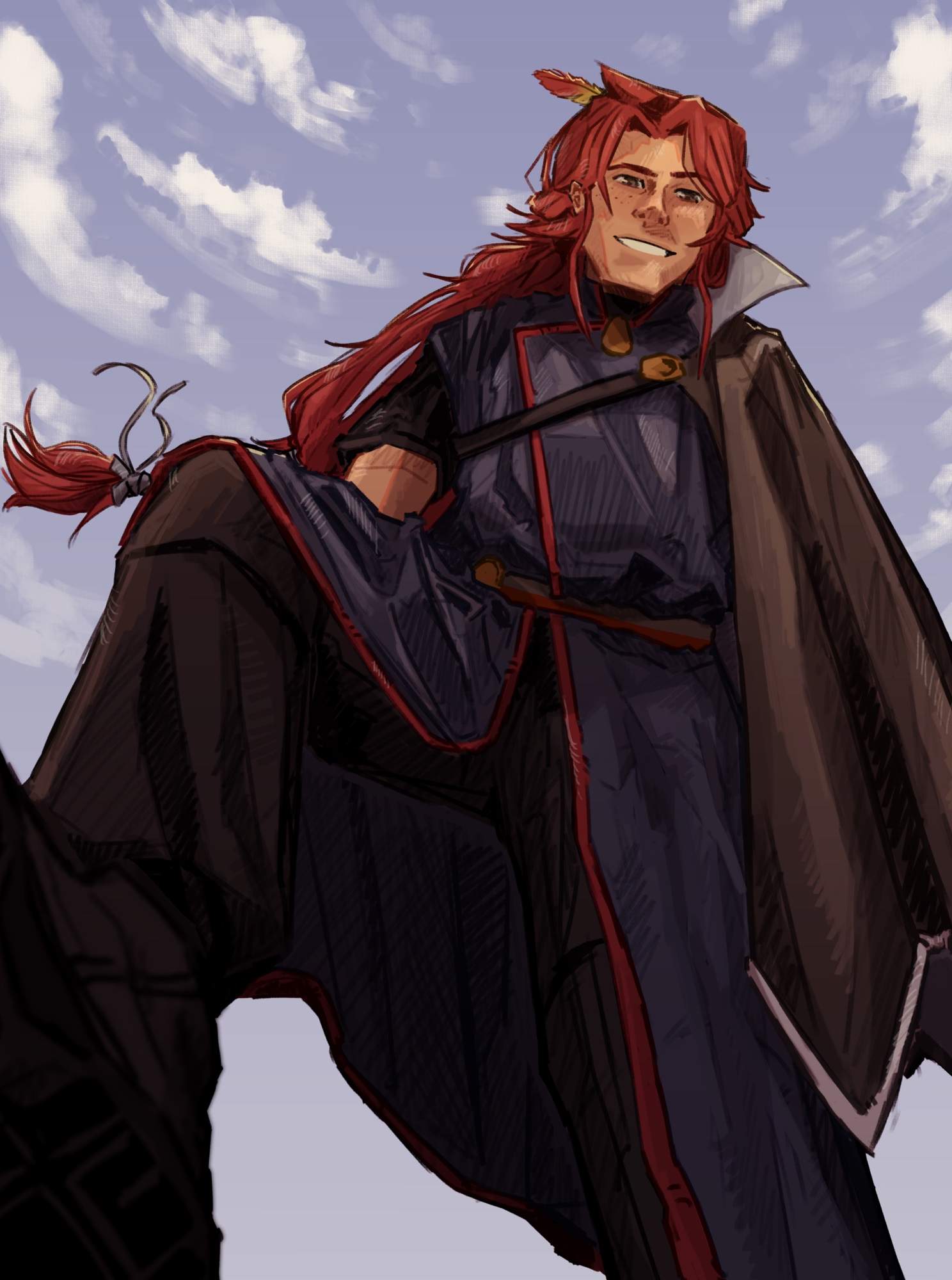 aged_up cloud cloudy_sky cowlick feather_hair_ornament feathers freckles from_below hair_ornament highres leg_up long_coat long_hair low-tied_long_hair nintendo pokemon pokemon_gold/silver/crystal red_hair silver_(pokemon) sky smile thenorthernstar very_long_hair
