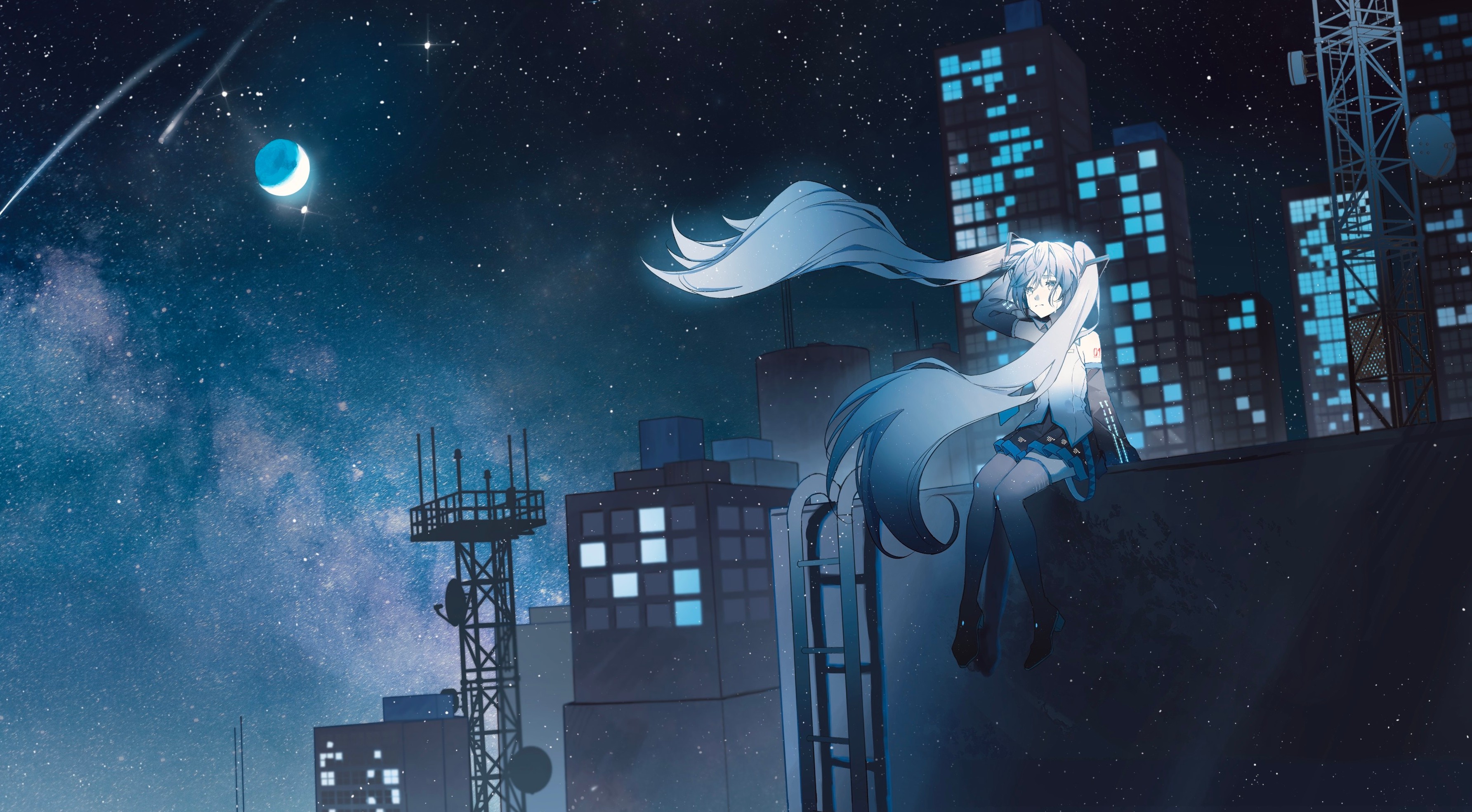 1girl absurdly_long_hair absurdres bare_shoulders blue_eyes blue_hair building constellation crescent_moon crying detached_sleeves floating_hair hair_ornament hatsune_miku highres long_hair moon night shooting_star sitting skirt sky solo star_(sky) starry_sky starry_sky_print thighhighs twintails very_long_hair vocaloid yurun_(yurun_ume)