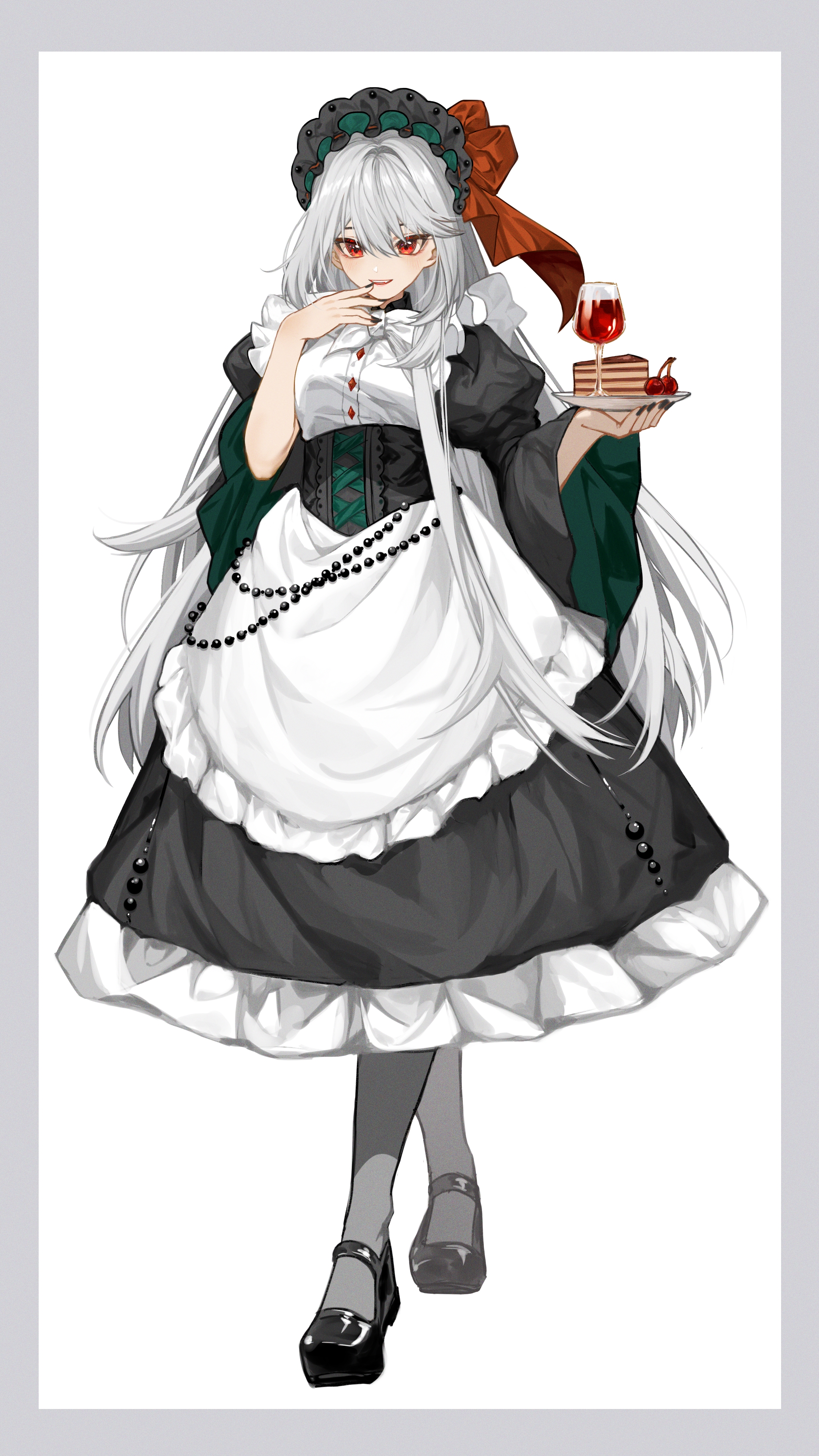 1girl :d absurdres alcohol alternate_costume apron baiye_renxing black_dress black_headdress black_nails black_shoes border bow cake cake_slice cherry crossed_legs cup dress drinking_glass finger_to_mouth food frilled_apron frills fruit full_body grey_border grey_pantyhose hair_bow hand_up hands_up highres holding holding_plate juliet_sleeves long_dress long_hair long_sleeves looking_at_viewer maid maid_headdress mary_janes open_mouth pantyhose plate puffy_sleeves red_bow red_eyes reverse:1999 semmelweis_(reverse:1999) shoes smile solo standing very_long_hair watson_cross white_apron white_background white_hair wide_sleeves wine wine_glass