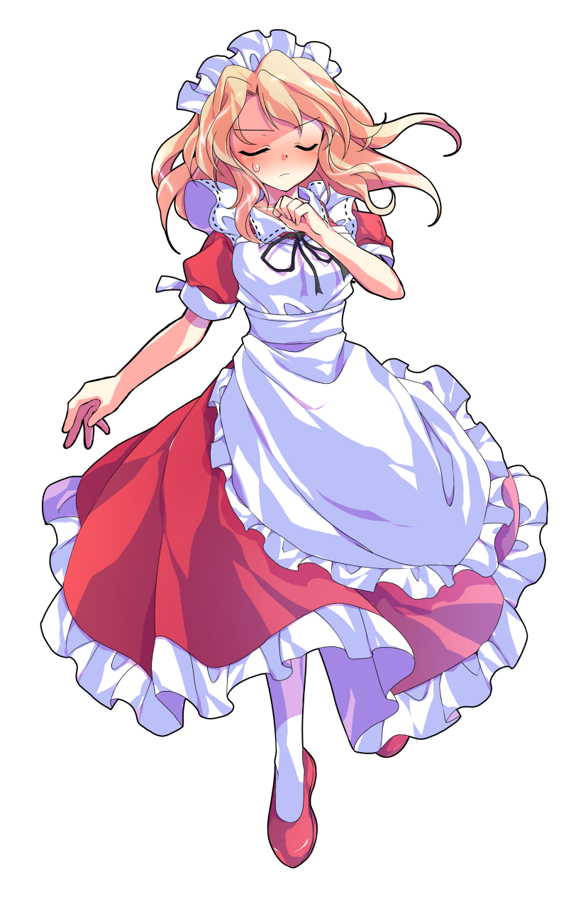 1girl apron black_ribbon blonde_hair blush closed_mouth commentary_request dairi dress facing_viewer frilled_apron frilled_dress frills full_body hand_up highres large_variant_set long_hair maid_headdress neck_ribbon pantyhose red_dress red_shoes ribbon shoes short_sleeves solo standing sweatdrop touhou touhou_(pc-98) transparent_background v-shaped_eyebrows variant_set white_apron white_pantyhose yellow_eyes yumeko_(touhou)
