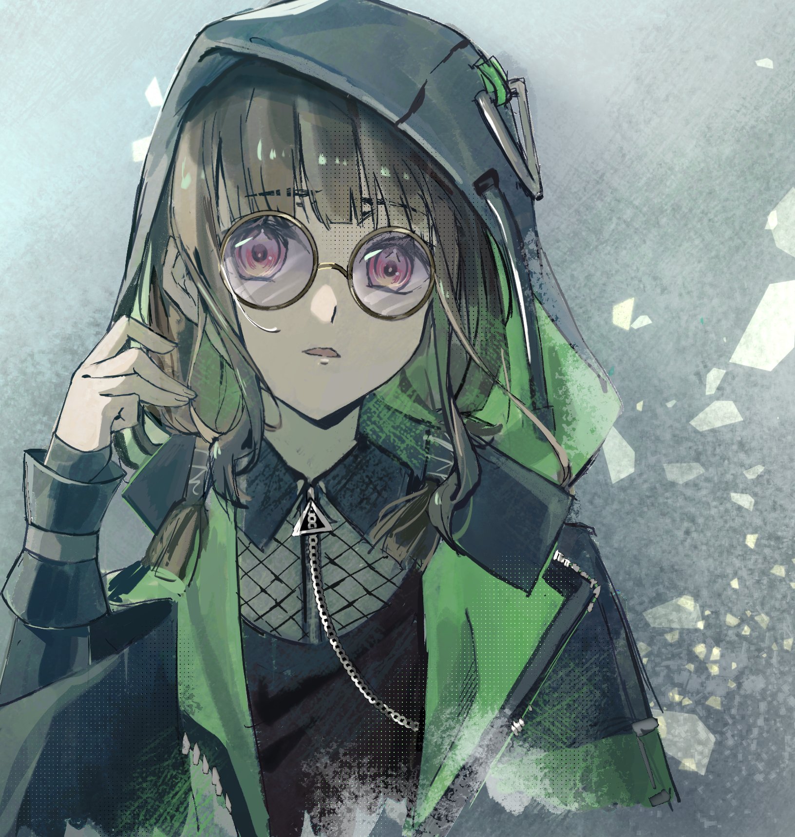 1girl i_my_mayday blunt_bangs brown_hair coat collared_shirt commentary fishnet_top fishnets glasses green_coat grey_background highres hood hood_up kachimachi_kosuzu link!_like!_love_live! looking_at_viewer love_live! low_twintails mizuno_(shuishui) official_alternate_costume open_clothes open_coat parted_lips pink_eyes round_eyewear shirt short_twintails sidelocks solo untranslatable_commentary twintails upper_body virtual_youtuber