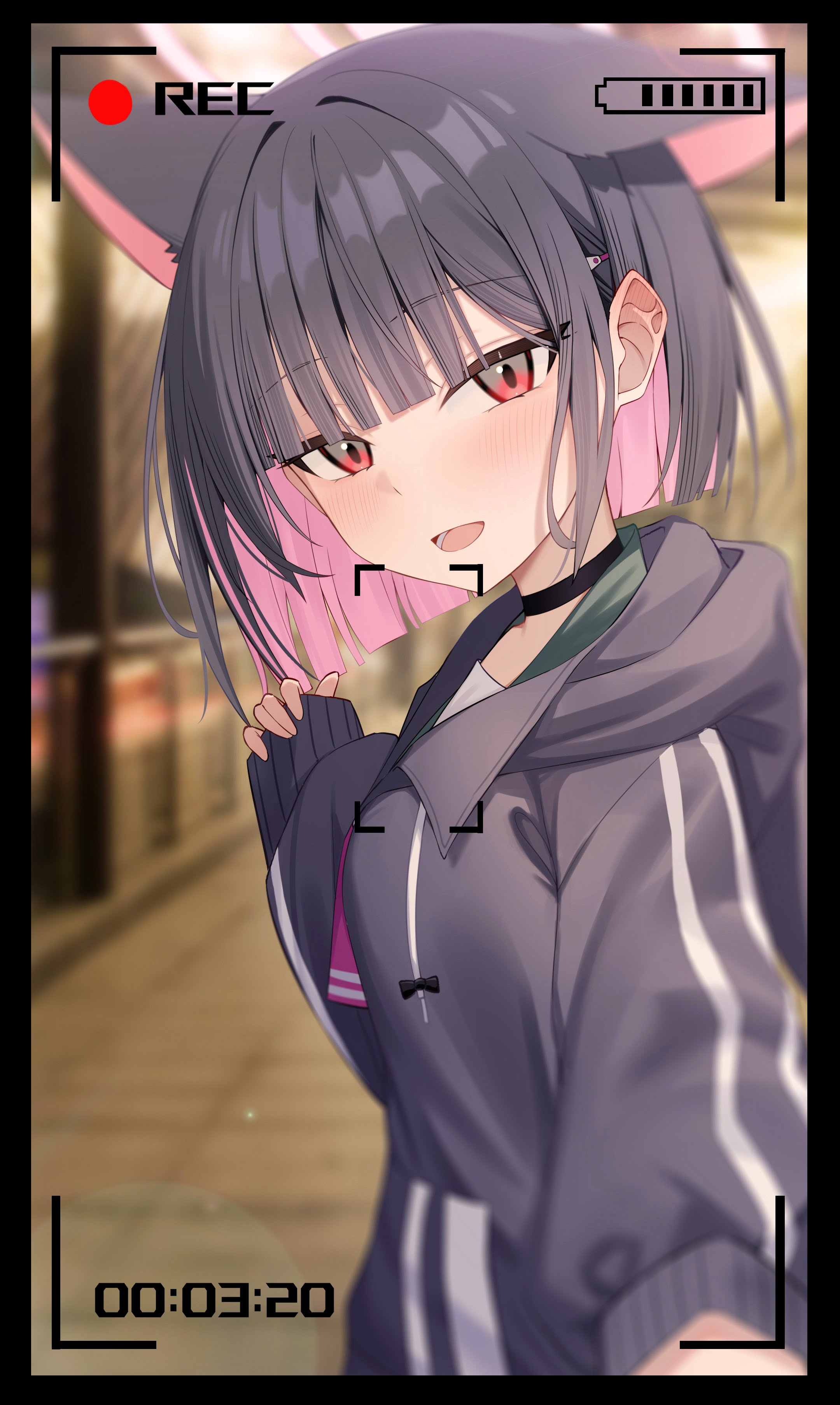1girl absurdres animal_ears black_choker black_hair black_jacket blue_archive blunt_bangs blunt_ends blush cat_ears cat_girl choker colored_inner_hair extra_ears highres jacket kazusa_(blue_archive) looking_at_viewer multicolored_hair open_mouth pink_eyes short_hair sidelocks solo two-tone_hair viewfinder wendao